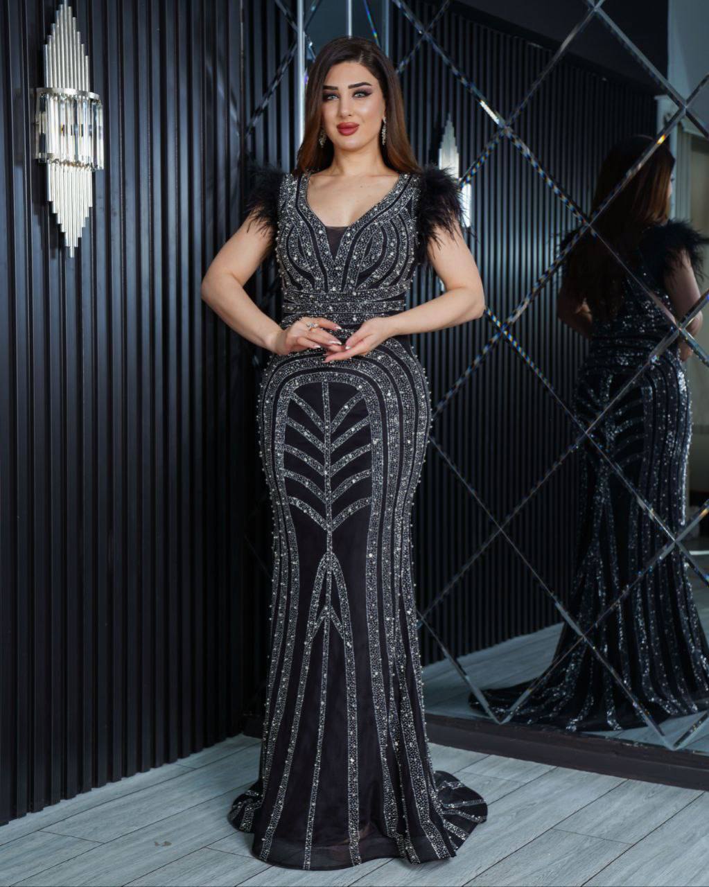 فستان سهرة فاخر مصمم بتفاصيل دقيقة من الخرز على طول الفستان. يتميز بأكتاف مزينة بالريش وتصميم أنيق يعكس الأنوثة والرقي. مثالي للمناسبات الخاصة والفعاليات الليلية، ومصنوع من مواد عالية الجودة لضمان الراحة والفخامة