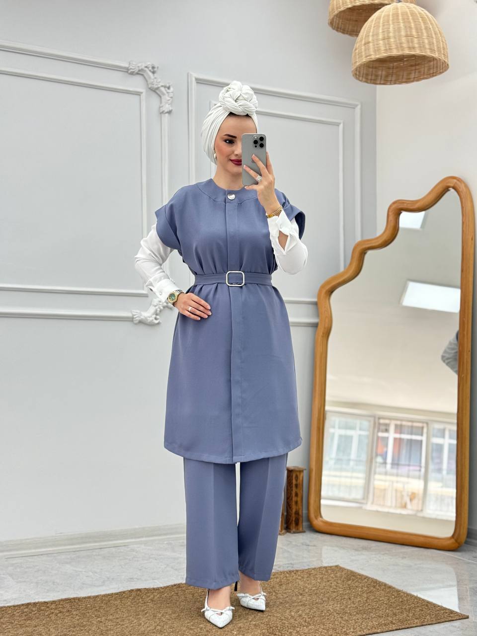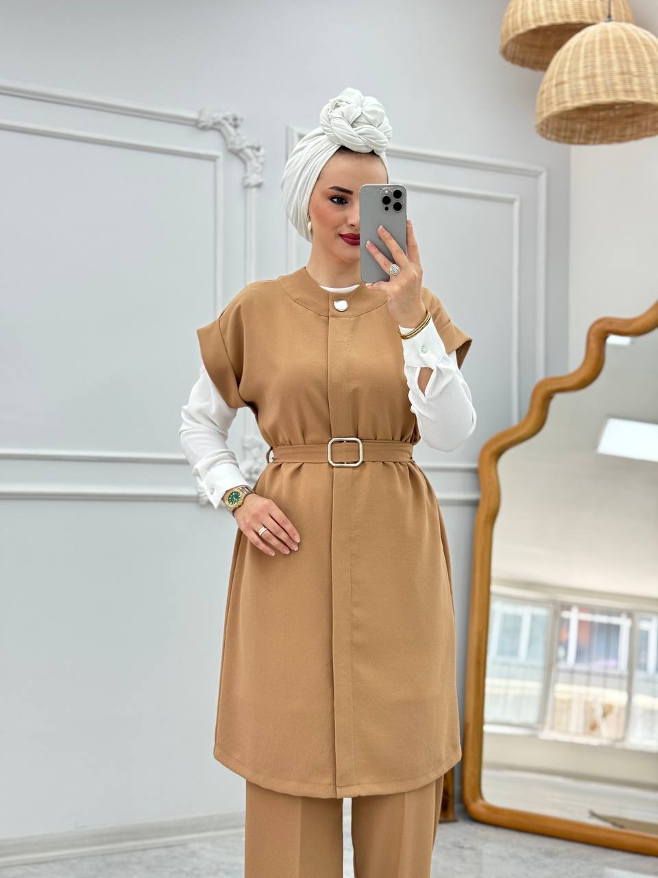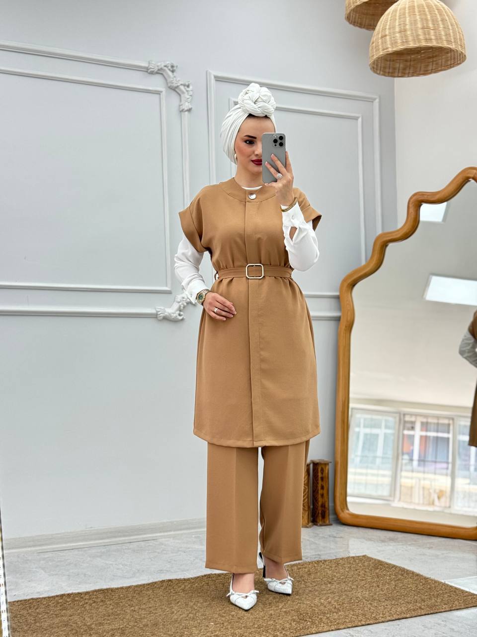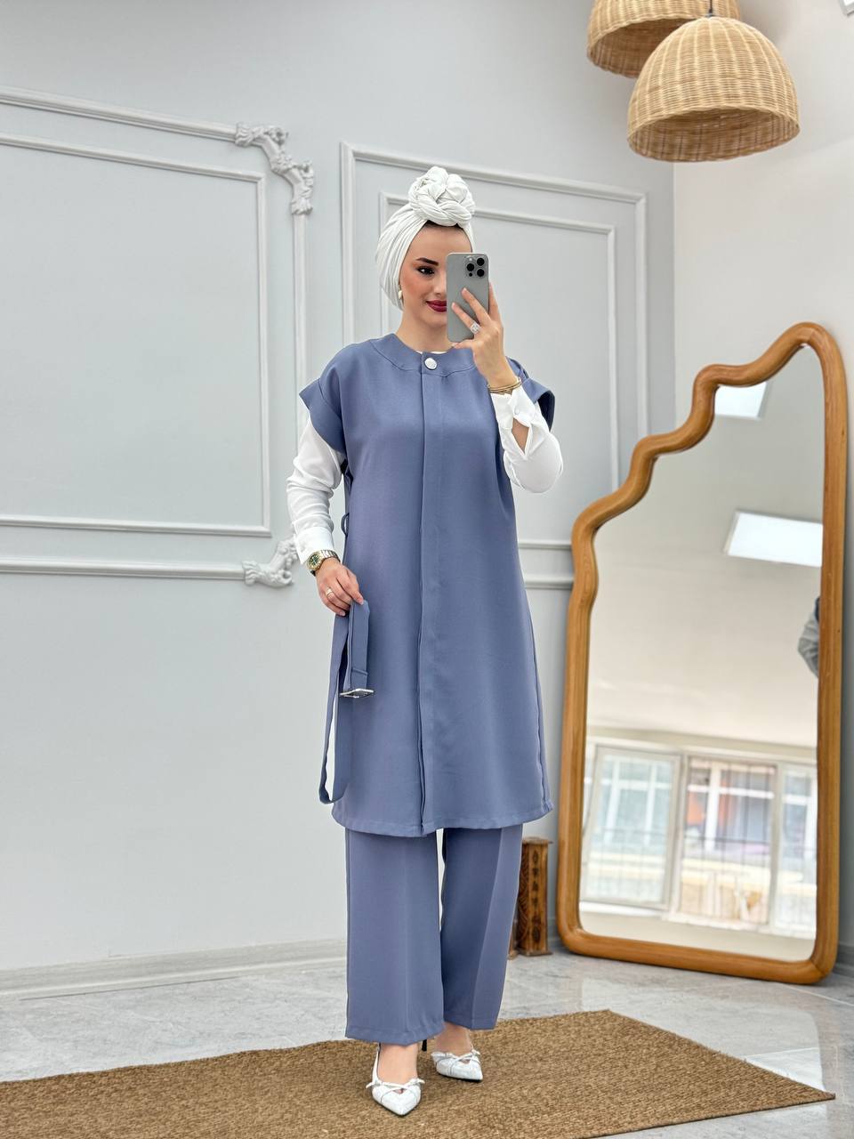مجموعة نسائية أنيقة تتكون من بنطلون واسع الساق وسترة بحزام، مثالية لكل من المظهر غير الرسمي والرسمي. مصنوعة من مواد عالية الجودة، توفر الراحة والأناقة طوال اليوم.