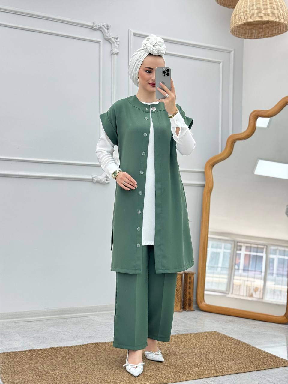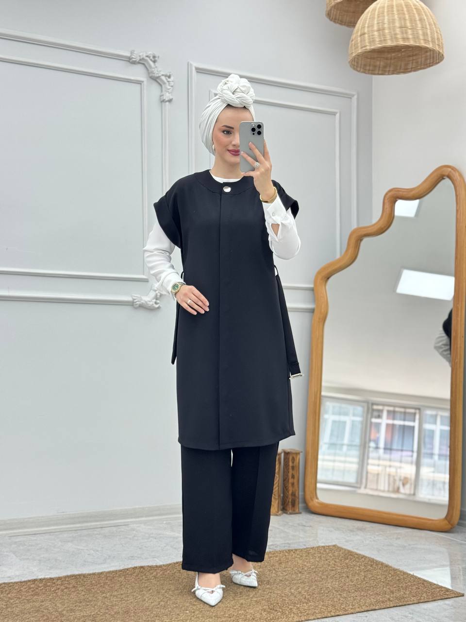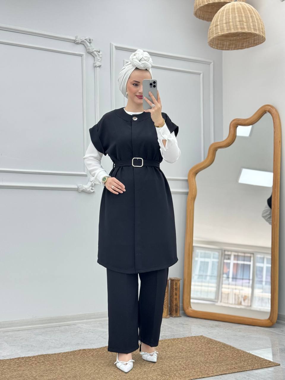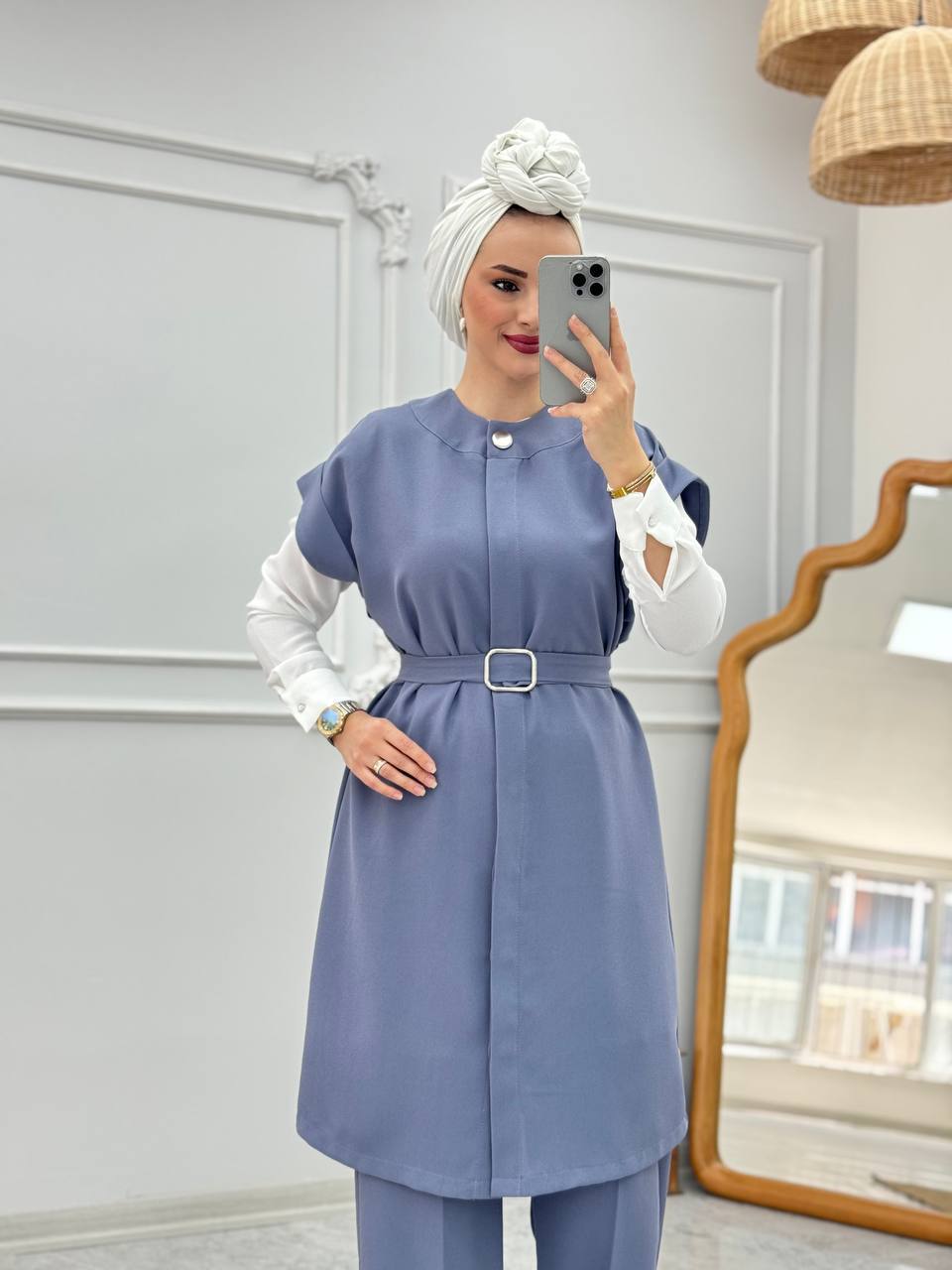 مجموعة نسائية أنيقة تتكون من بنطلون واسع الساق وسترة بحزام، مثالية لكل من المظهر غير الرسمي والرسمي. مصنوعة من مواد عالية الجودة، توفر الراحة والأناقة طوال اليوم.
