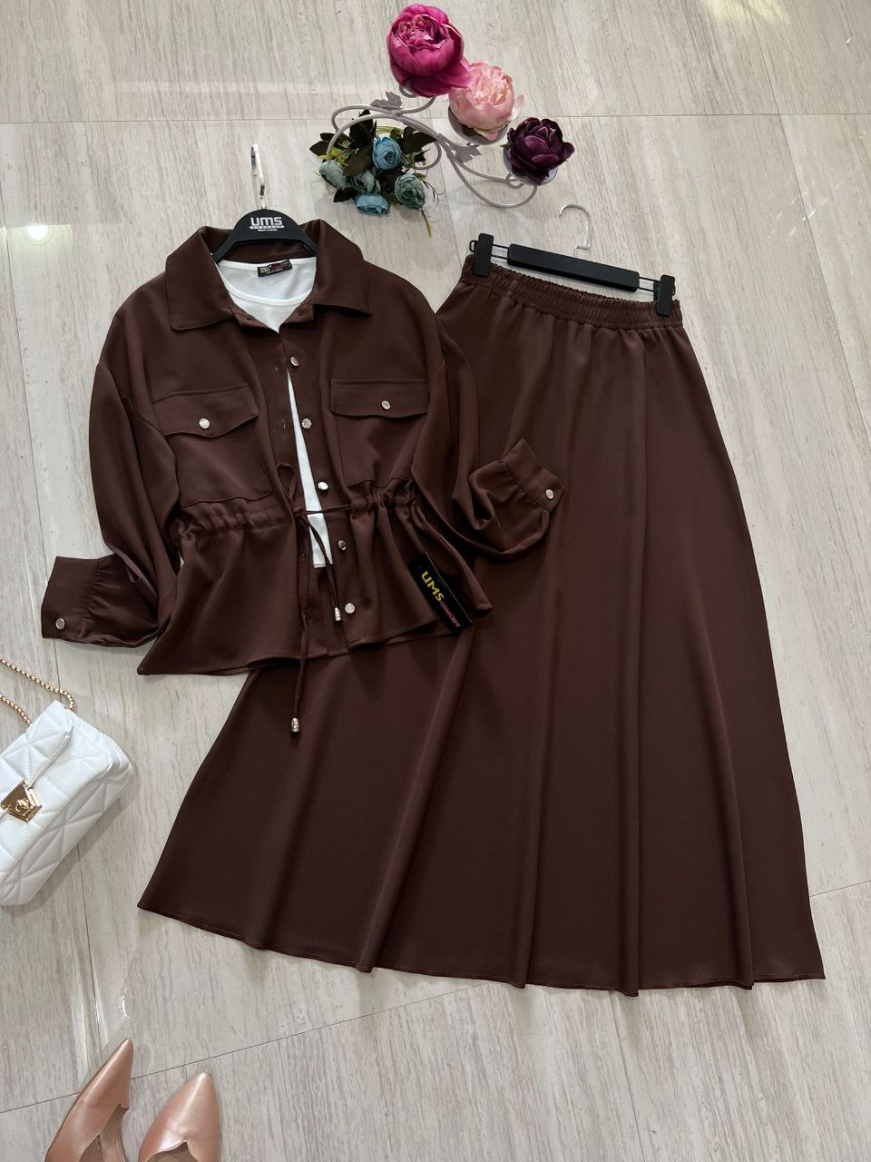 طقم أنيق يتكون من بلوزة مع سترة وتنورة طويلة. مثالي للارتداء اليومي أو المناسبات الخاصة بتصميم عصري ومريح.
