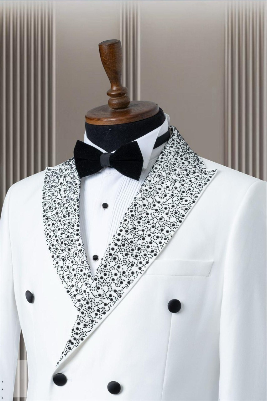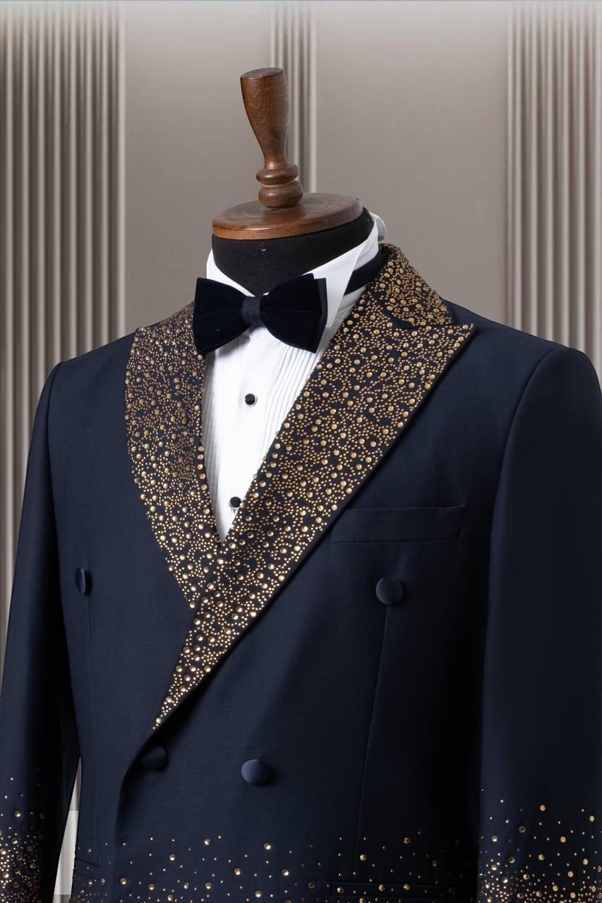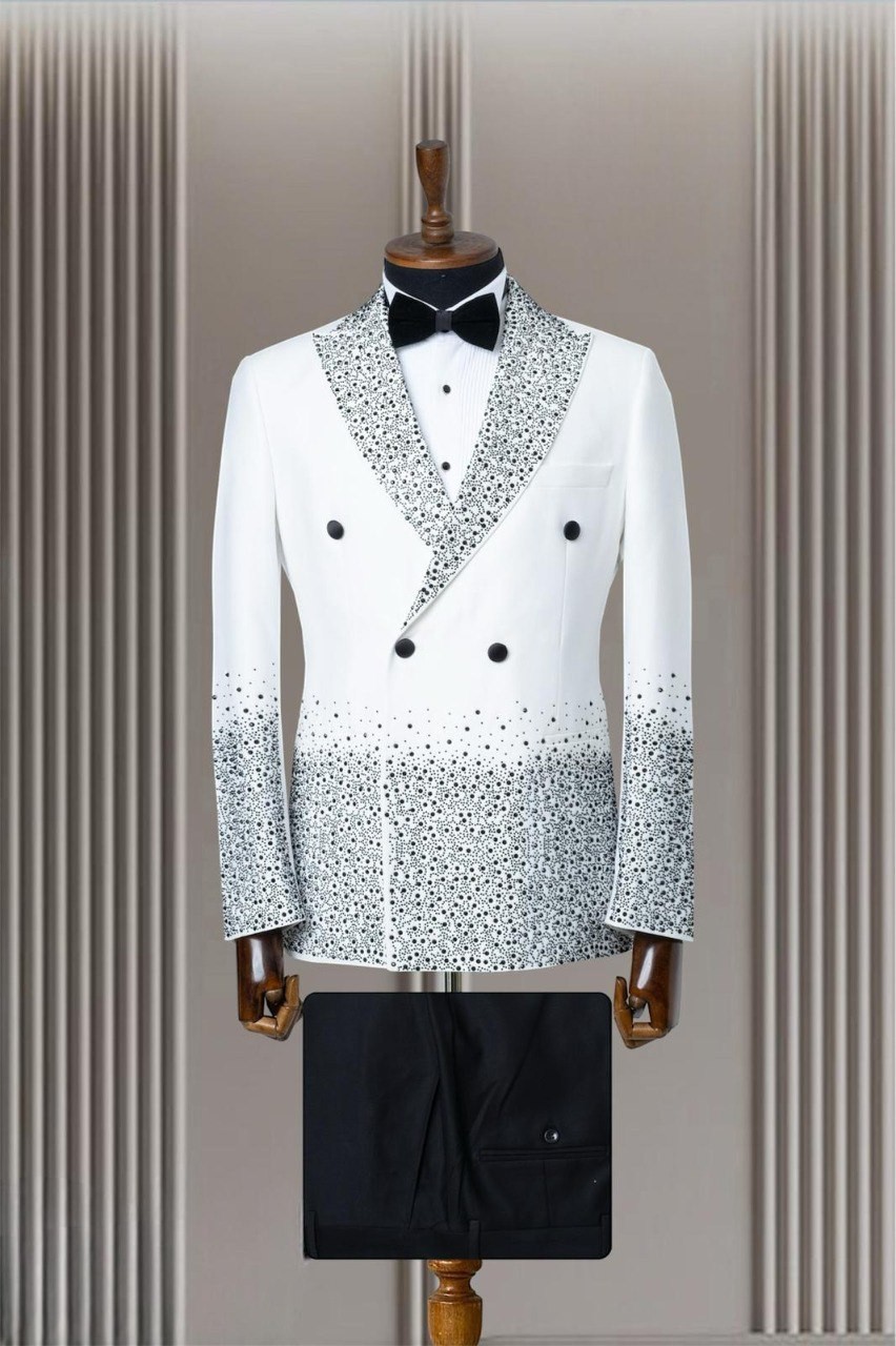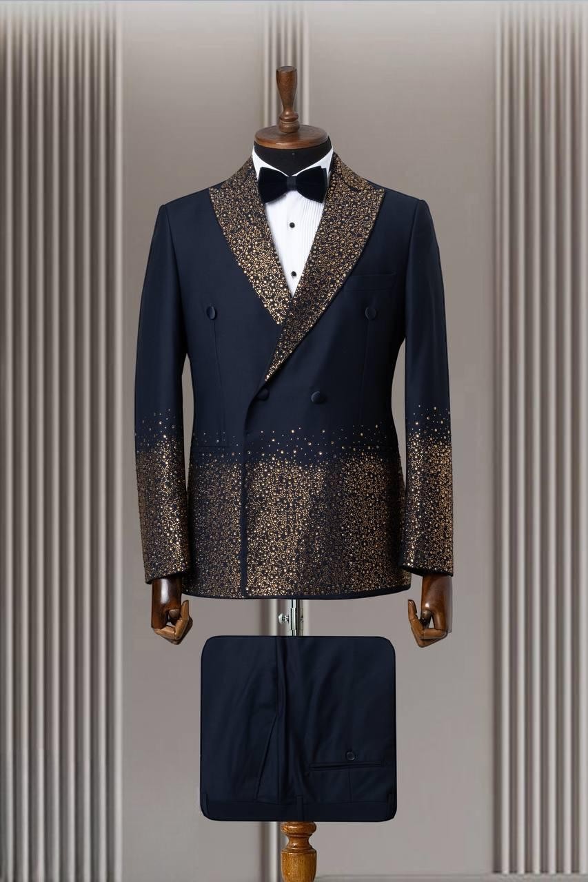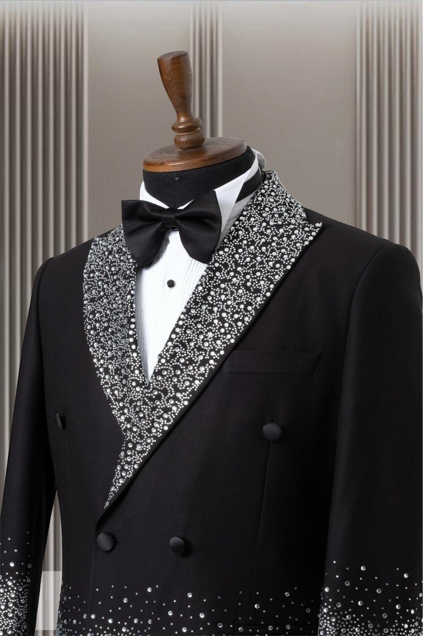 اجعل نفسك محط الأنظار مع هذه البدلة المزدوجة الصدر المزينة بتطريزات كريستالية رائعة. مثالية للمناسبات الرسمية والاحتفالات الكبرى، تجمع هذه البدلة بين الأسلوب الكلاسيكي ولمسة من البذخ.