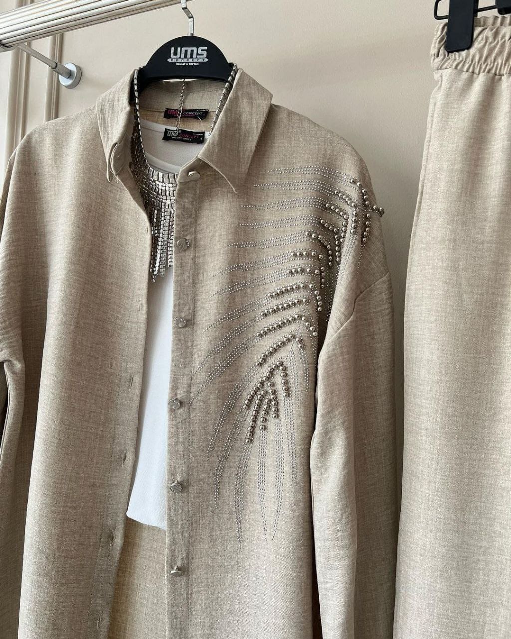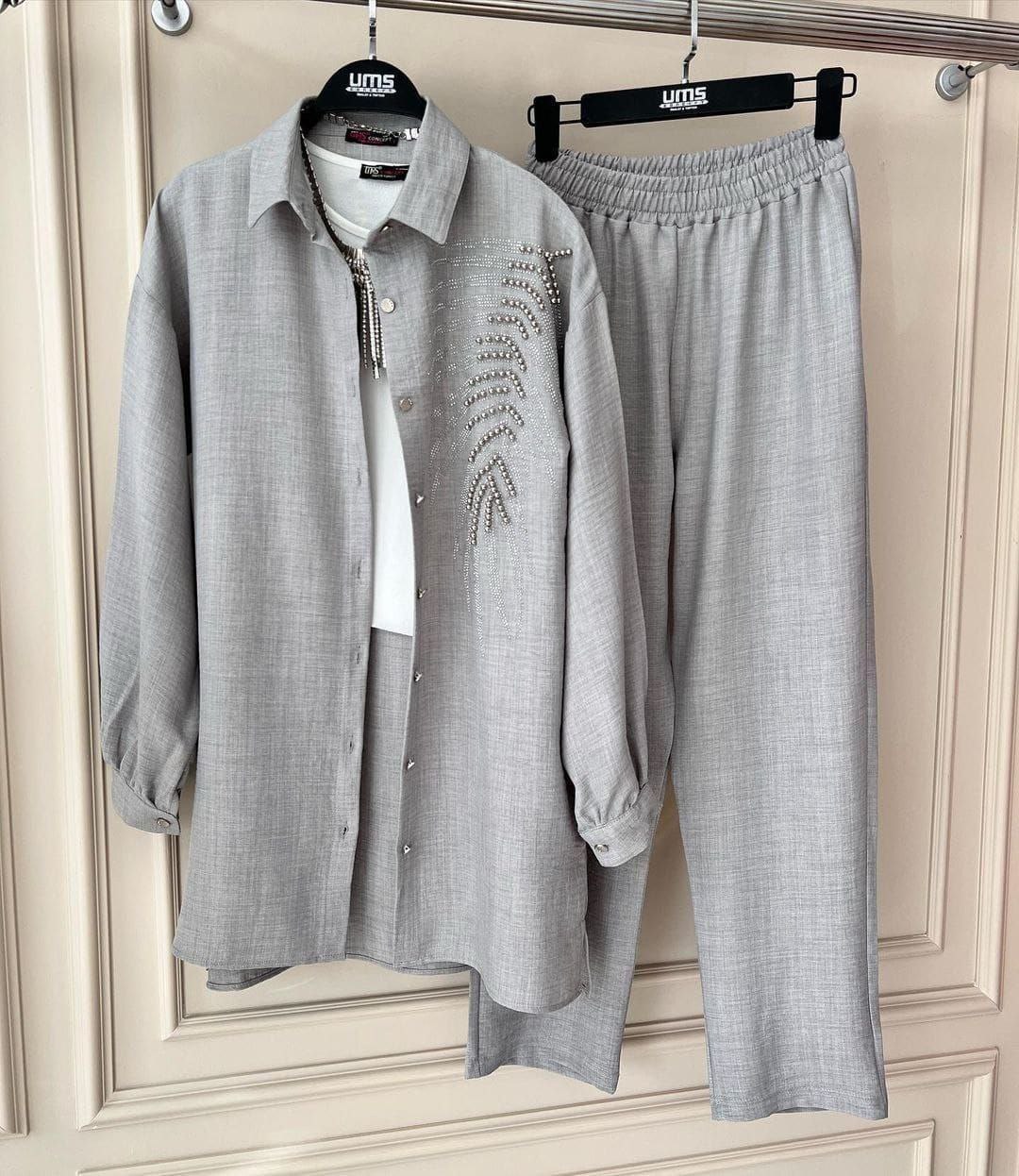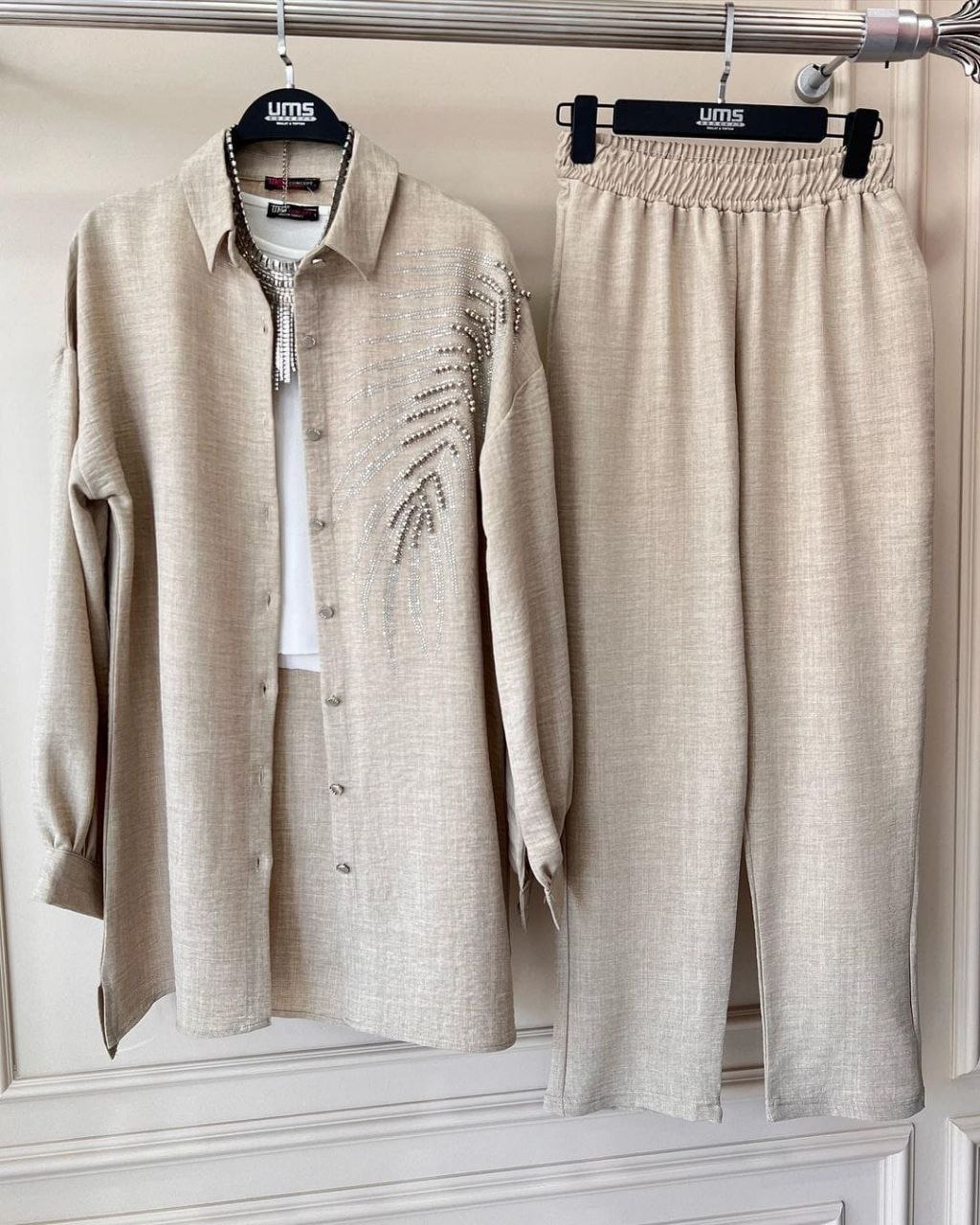 طقم أنيق يتضمن سترة مزينة بتفاصيل من الخرز وسروال متطابق. مثالي للمناسبات الخاصة والارتداء الأنيق اليومي