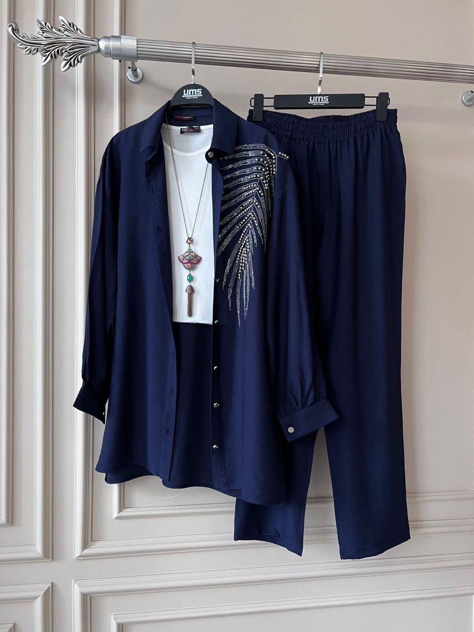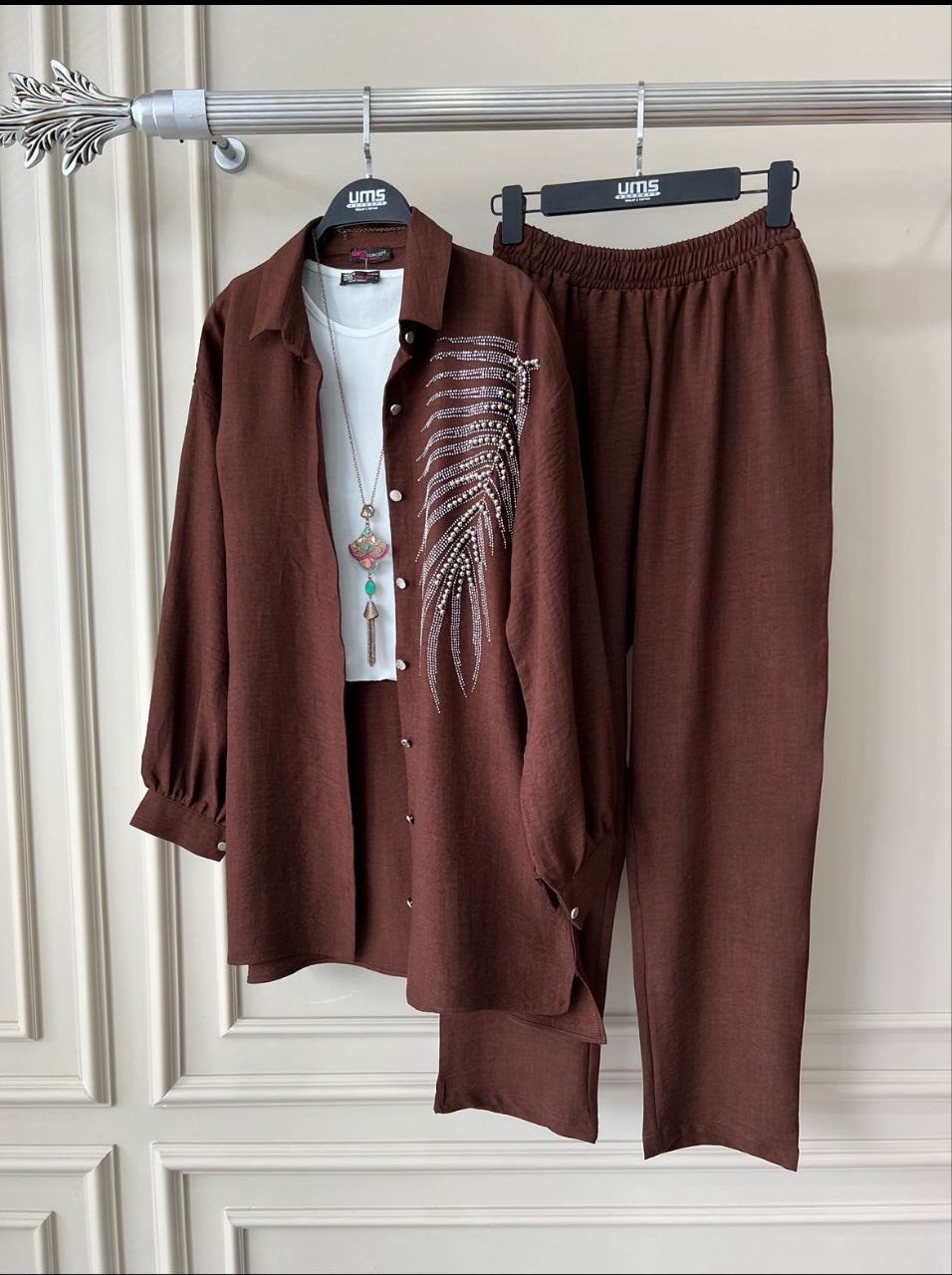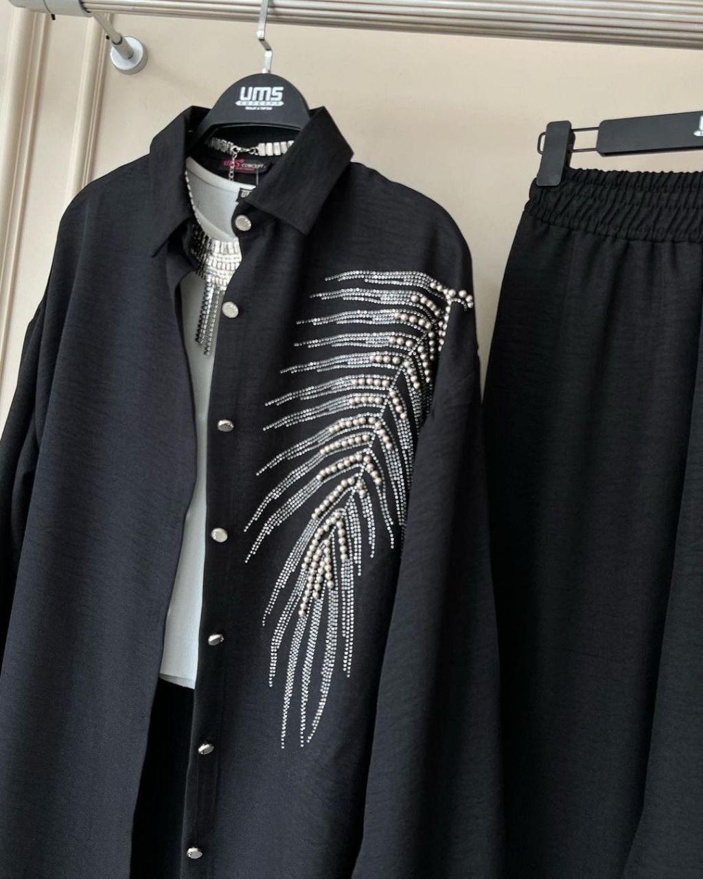 طقم أنيق يتضمن سترة مزينة بتفاصيل من الخرز وسروال متطابق. مثالي للمناسبات الخاصة والارتداء الأنيق اليومي