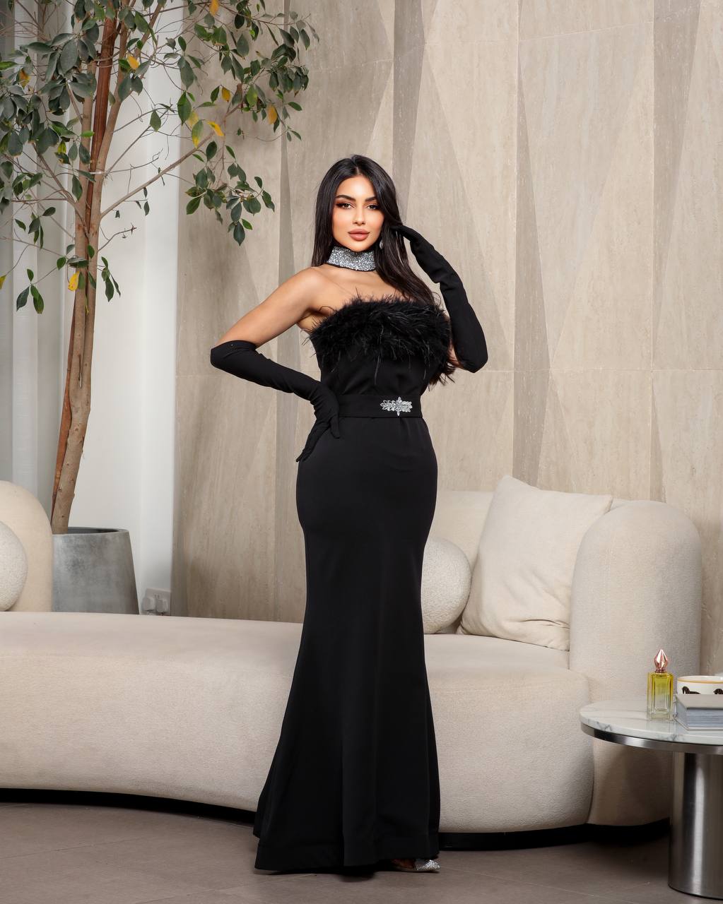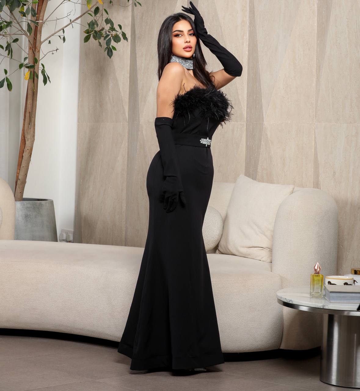 فستان سهرة أسود فاخر مع زخارف من الريش على الصدر والحاشية. يتميز بتصميم أنيق وجذاب مع قفازات طويلة وحزام مرصع بالجواهر، وهو مثالي للحفلات والمناسبات الخاصة. مصنوعة من مواد عالية الجودة لضمان الراحة والفخامة.