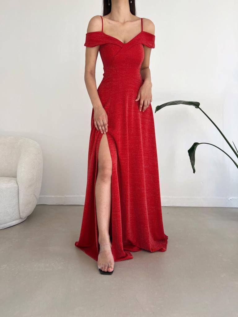 • فستان سهرة أنيق، يتميز بتصميم مكشوف الأكتاف وشق جانبي لإطلالة فاتنة وفاخرة. مصنوع من قماش عالي الجودة يوفر الراحة والمرونة. مثالي للحفلات والمناسبات الخاصة