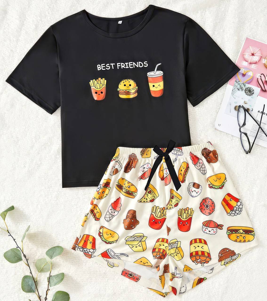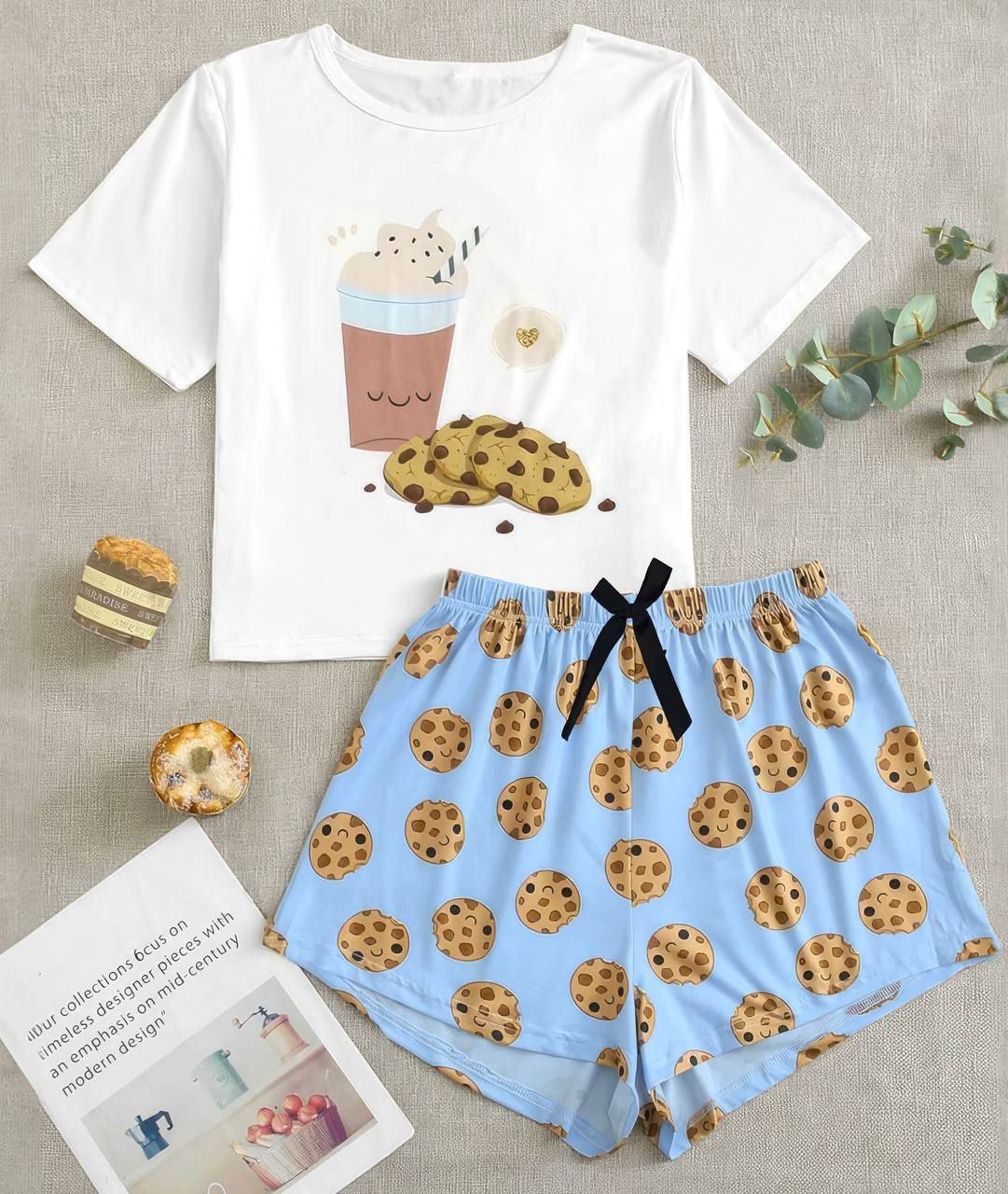 يتميز هذا الطقم الرائع من البيجاما بتصميم لطيف بنقشة الكوكيز، مما يجعله مثاليًا لقضاء ليلة مريحة في المنزل. يتضمن الطقم قميصًا قصير الأكمام مزين برسمة ممتعة للكوكيز وشيكولاته الحليب، وسروالًا قصيرًا بنقشة كوكيز شاملة. مصنوع من قماش ناعم وقابل للتنفس لضمان الراحة طوال الليل