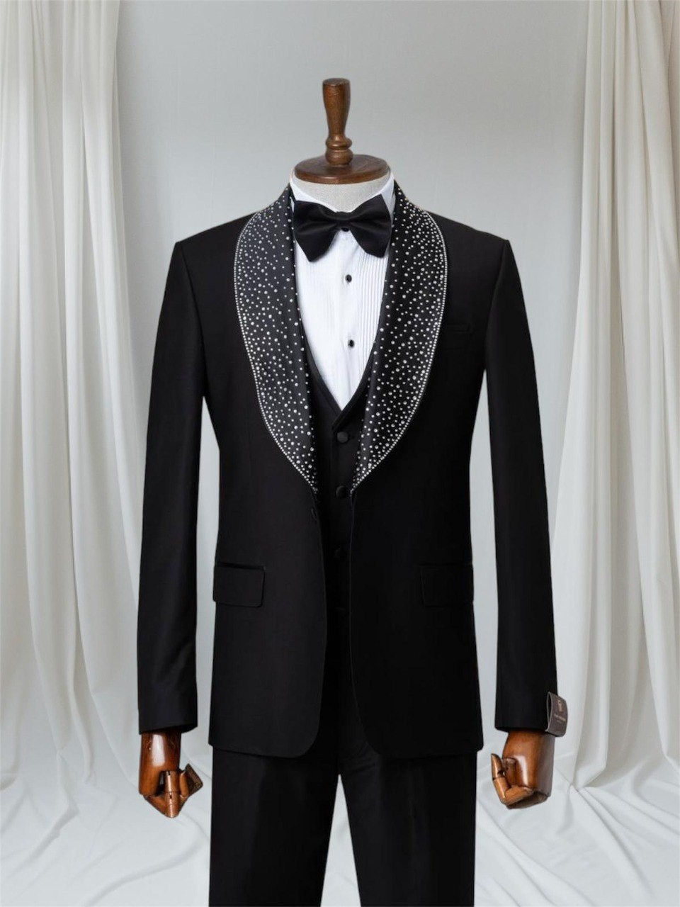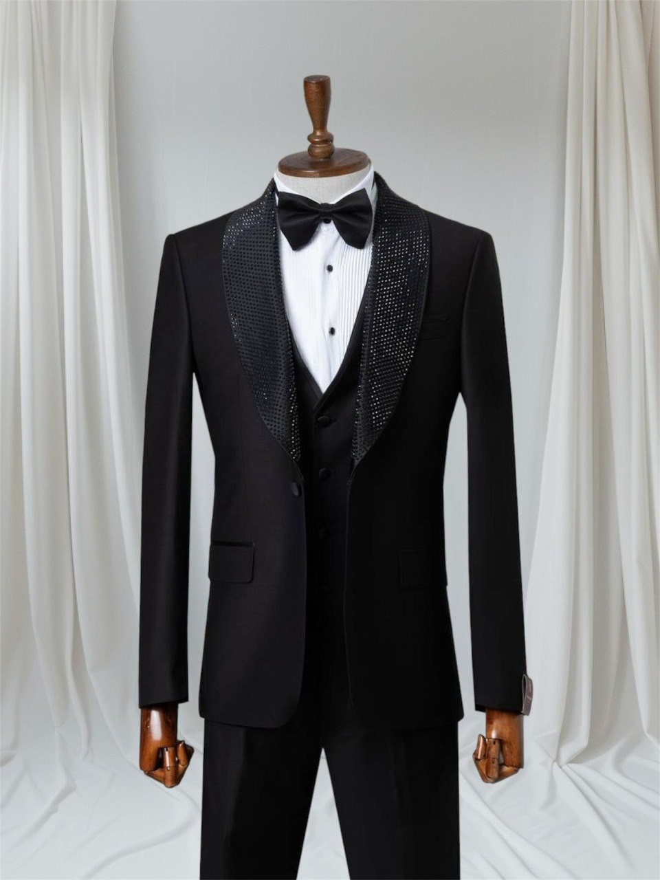 تتميز هذه البدلة التوكسيدو بلونها الأسود الأنيق مع ياقة مزخرفة. تأتي مع صديري متناسب وربطة عنق، مما يجعلها خيارًا مثاليًا للمناسبات الرسمية والأحداث الخاصة. مصنوعة من قماش عالي الجودة، توفر مظهرًا أنيقًا وفاخرًا