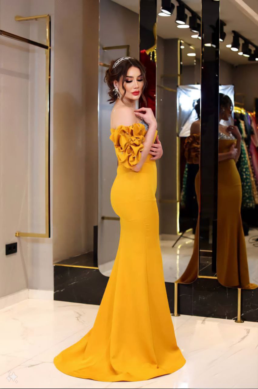 يتميز هذا الفستان المسائي الأنيق بلمسات فضية رائعة على الصدر وأكمام منتفخة ومزينة بأسلوب مميز بدون أكتاف. يوفر الفستان مظهراً أنيقاً ومتطوراً، مثالي لأي فعالية رسمية أو مناسبة خاصة.