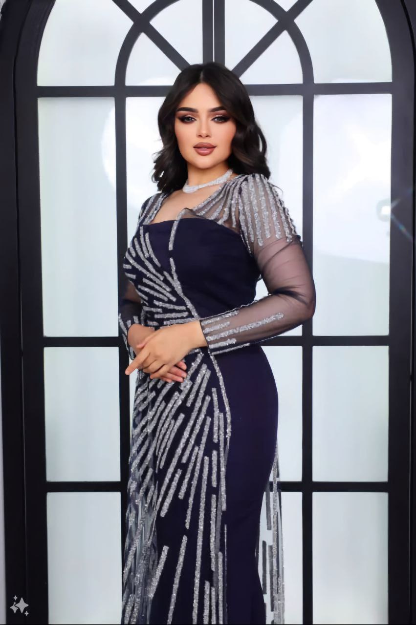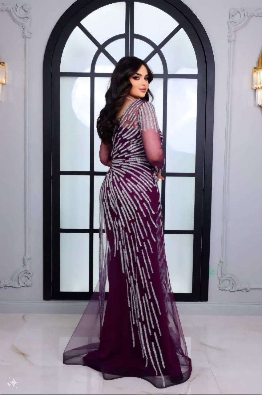 هذا الفستان المسائي الأنيق مزين بتفاصيل فضية رائعة، مما يخلق مظهراً جذاباً وأنيقاً. يتميز الفستان بأكمام شفافة وقصة متدفقة، مما يجعله مثالياً لإحداث تأثير مميز في أي فعالية رسمية أو مناسبة خاصة.