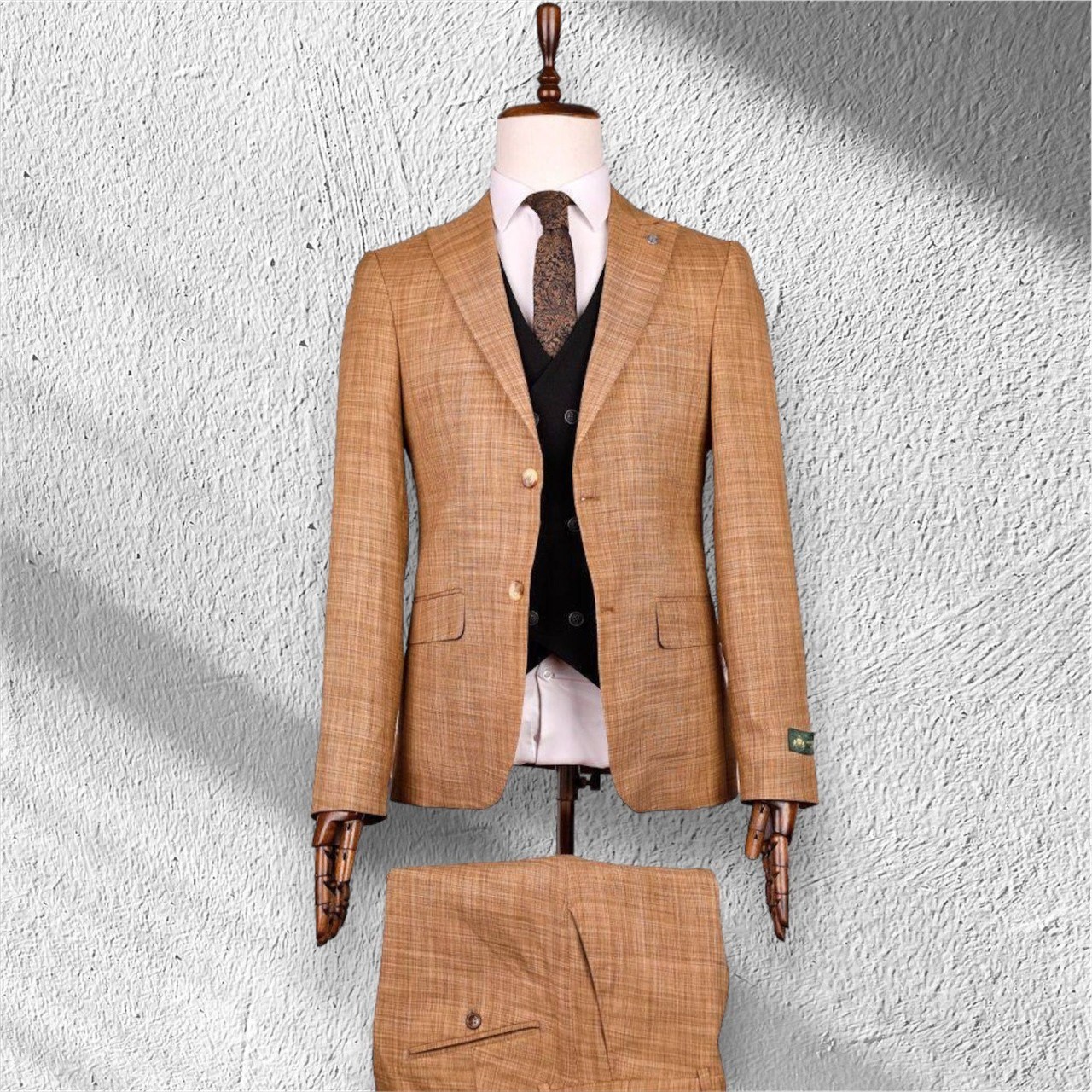 بدلة رجالية أنيقة مصنوعة من خامات عالية الجودة، تتميز بتصميم عصري وقصة مريحة تناسب جميع المناسبات الرسمية. تشمل البدلة سترة وسروال بلون بني فاتح مع تفاصيل دقيقة تضيف لمسة من الأناقة.