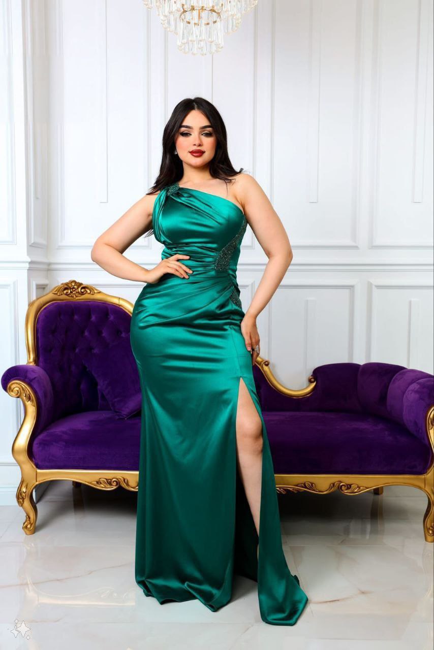 فستان سهرة أنيق ذو كتف واحد، مصنوع من قماش الساتان الفاخر، ويتميز بشق عصري وتفاصيل زينة دقيقة، مثالي للفعاليات الرسمية والمناسبات الخاصة