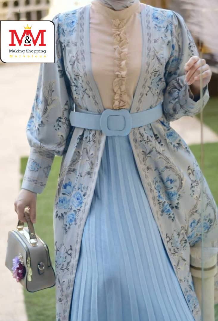 فستان سهرة فاخر مزين بتطريز زهور وطيّات زرقاء فاتحة. يحتوي على حزام واسع عند الخصر يضيف لمسة أنثوية وأنيقة. مثالي للمناسبات الخاصة والحفلات، ومصنوع من مواد عالية الجودة لضمان الراحة والرقي