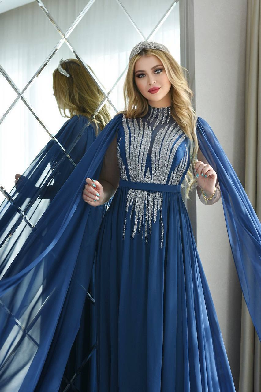 فستان سهرة رائع يتميز بتفاصيل فضية متقنة وقماش شفاف يتدفق بشكل أنيق. التصميم يضفي لمسة من الأناقة والتفرد، مثالي للمناسبات الرسمية والحفلات الخاصة.