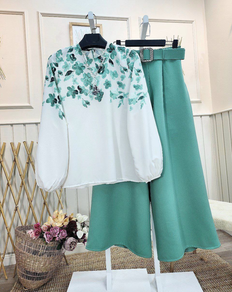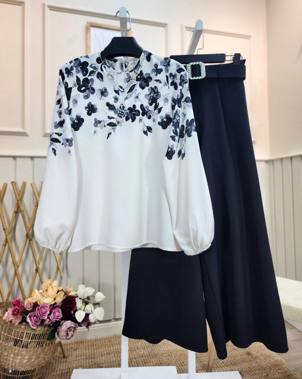 بلوزة أنيقة بنقشة زهور مزودة بسروال واسع الأرجل بنفس اللون. مثالية للاستخدام اليومي أو المناسبات الخاصة.