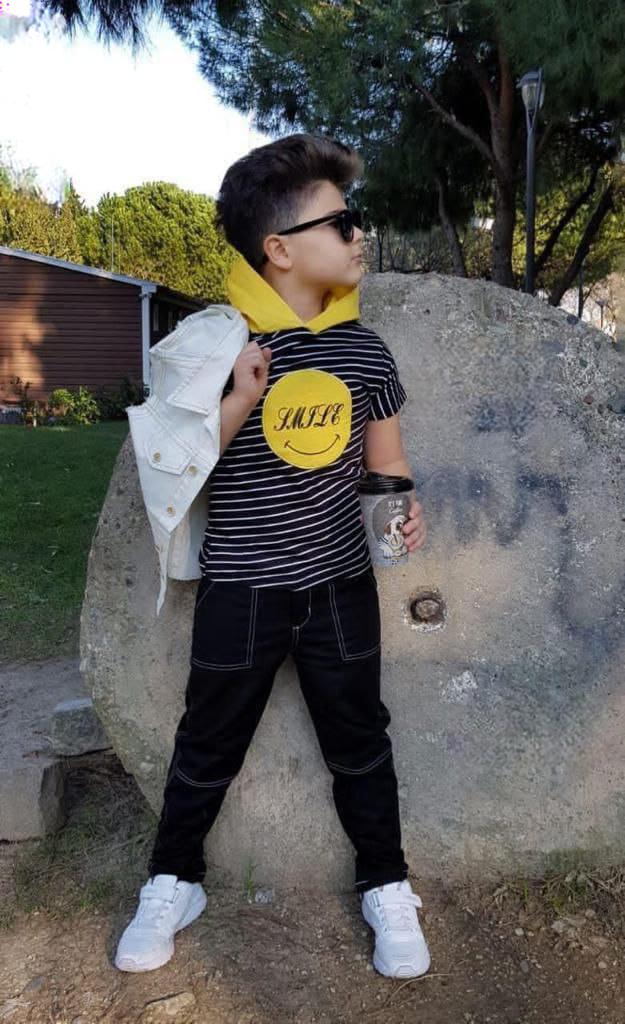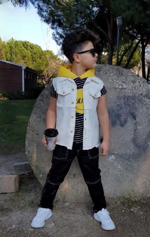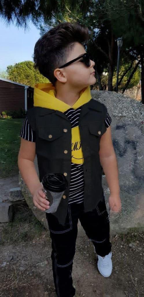 • Trendy and comfortable kids' casual outfit featuring a military style. The set includes a black T-shirt with camouflage sleeves and pocket, paired with green cargo pants. Perfect for casual wear and outdoor activities, offering a stylish and practical look for your child.