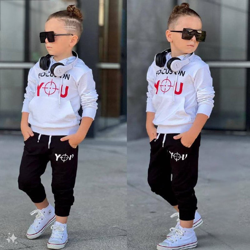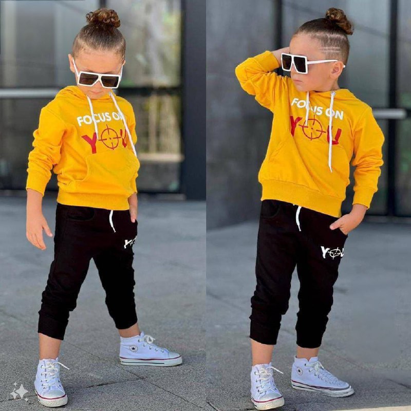 • طقم أطفال أنيق يتضمن هودي أزرق مزين بطبعة "Focus on You" وسروال أسود. يحتوي الهودي على غطاء رأس مزود بحبل وس pocket جيب أمامي، بينما يتميز السروال بخصر مرن لراحة إضافية. مثالي للارتداء غير الرسمي والأنشطة الخارجية. متوفر بمقاسات للأطفال الصغار والأطفال.