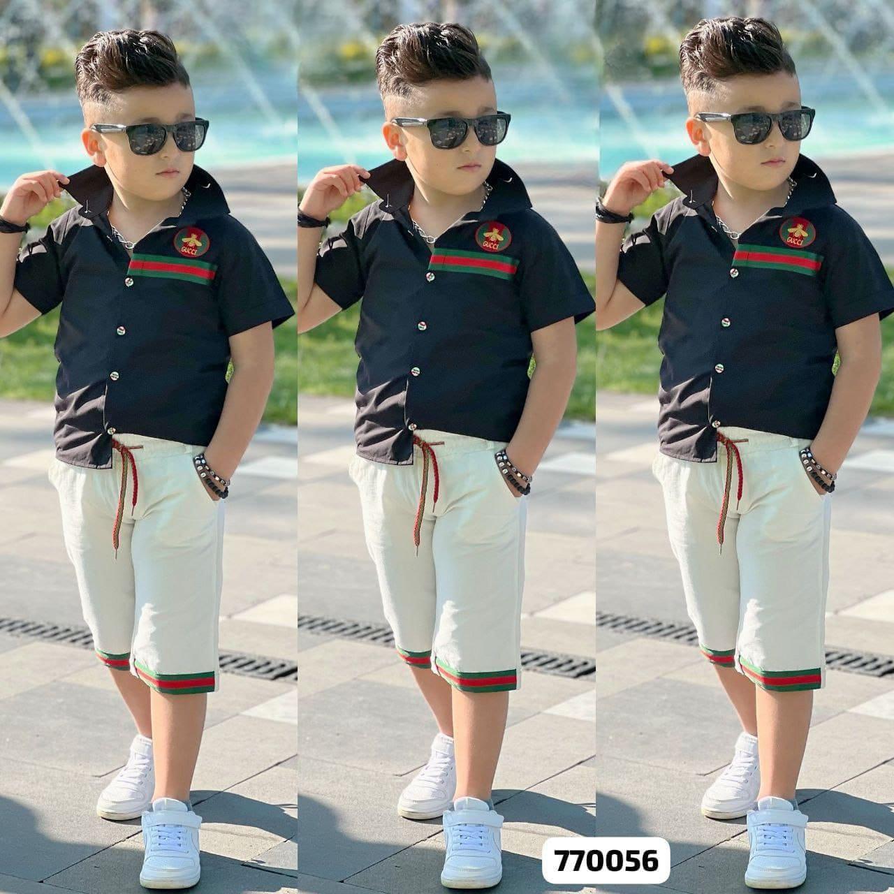 مجموعة ملابس أطفال أنيقة مستوحاة من Gucci، تتميز بقميص أبيض قصير الأكمام مع شريط أخضر وأحمر أنيق وتصحيح شعار، مقترن بشورت أسود مريح مع تفاصيل شريطية متطابقة. مثالي لمظهر أنيق وعصري لأي مناسبة.
