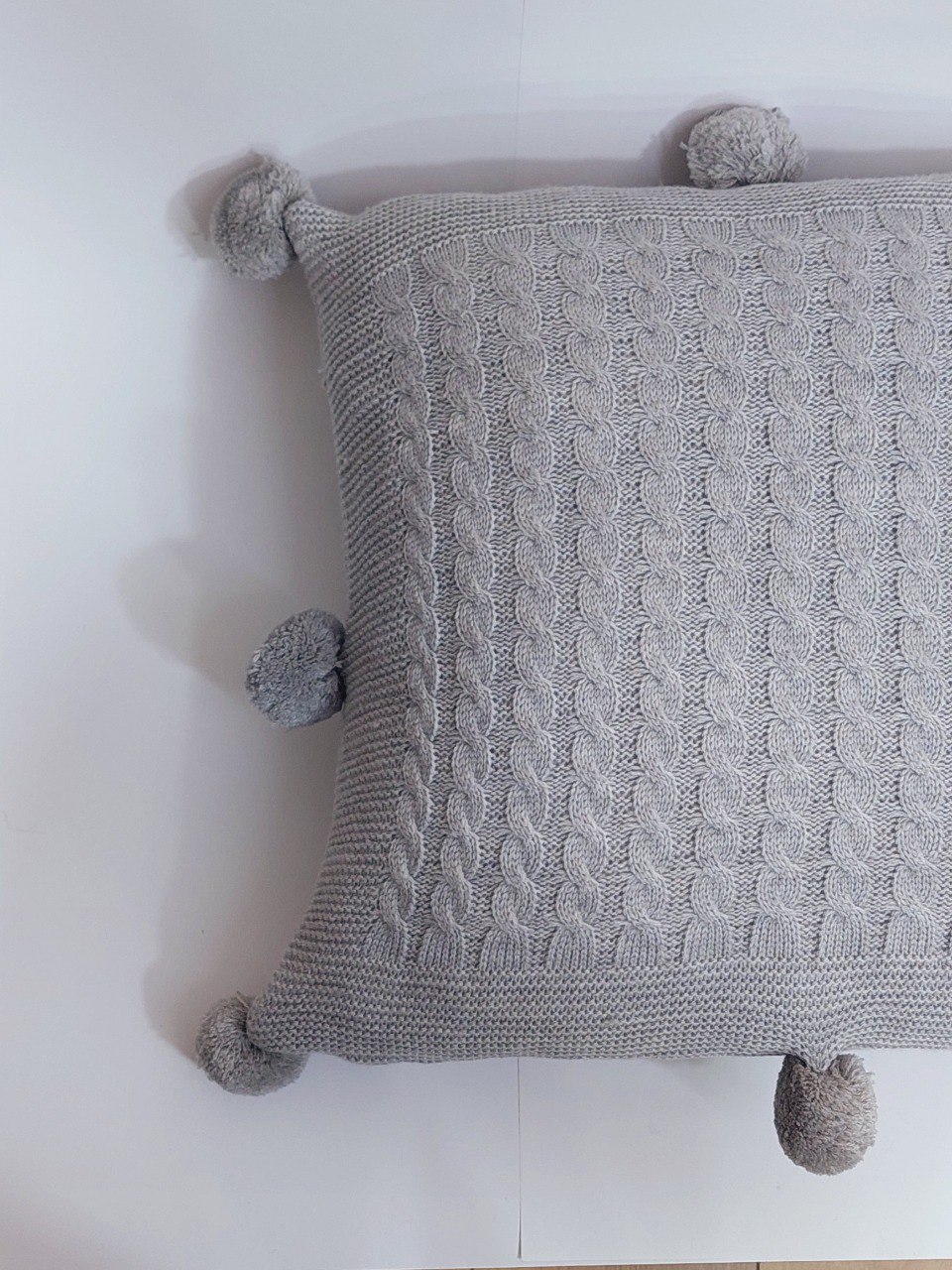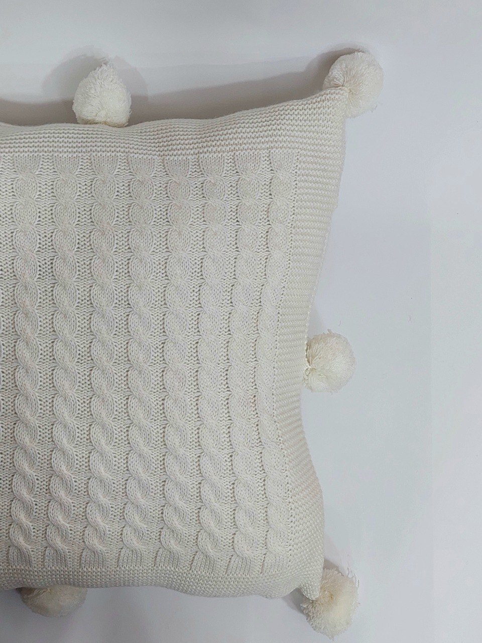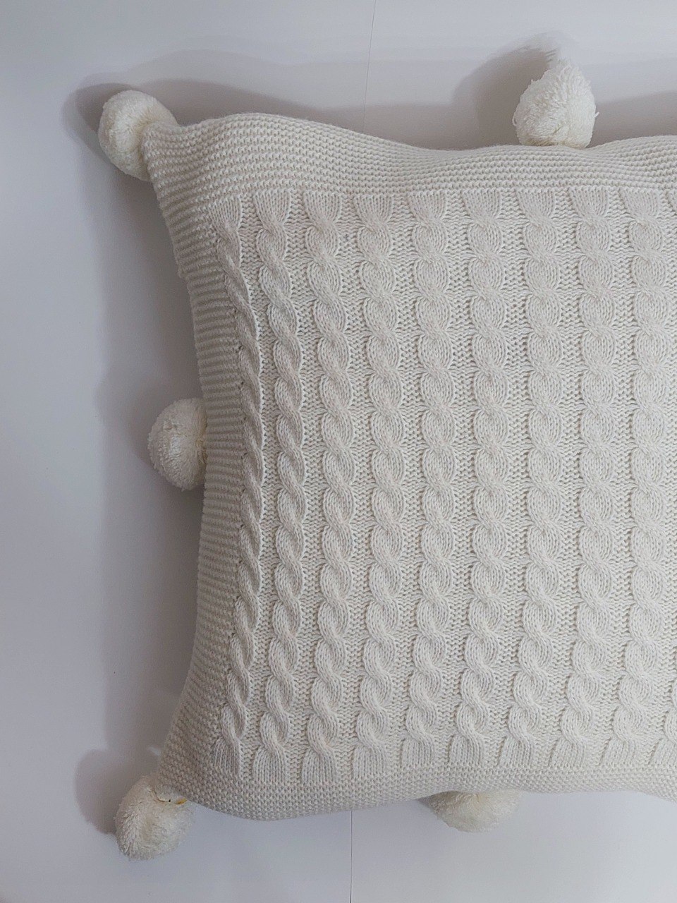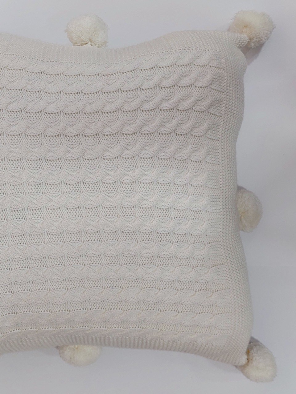 وسادة محبوكة عالية الجودة بتصميم كابل وأربع كرات pompoms في الزوايا، تضيف لمسة عصرية وراحة إلى أي غرفة.