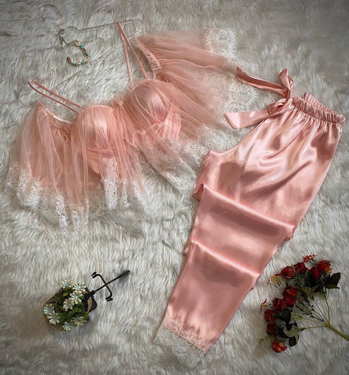 تكون هذا الطقم الأنيق من الساتان والدانتيل لخلق تصميم فريد وجذاب. يشمل الطقم توب قصير وسروال طويل مزين بتفاصيل من الدانتيل، مما يضيف لمسة من الرقي والأناقة. مثالي للنساء اللواتي يبحثن عن الراحة والأناقة في آن واحد.