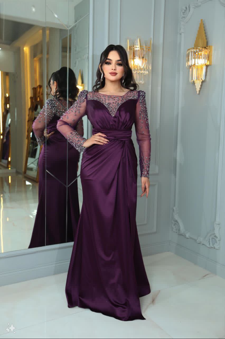 فستان سهرة فاخر يتميز بأكمام طويلة مزينة بتفاصيل دقيقة. يتميز الفستان بتصميم أنيق مع خصر متموج وياقة شفافة، مما يجعله مثالياً للمناسبات الرسمية والأحداث الخاصة.