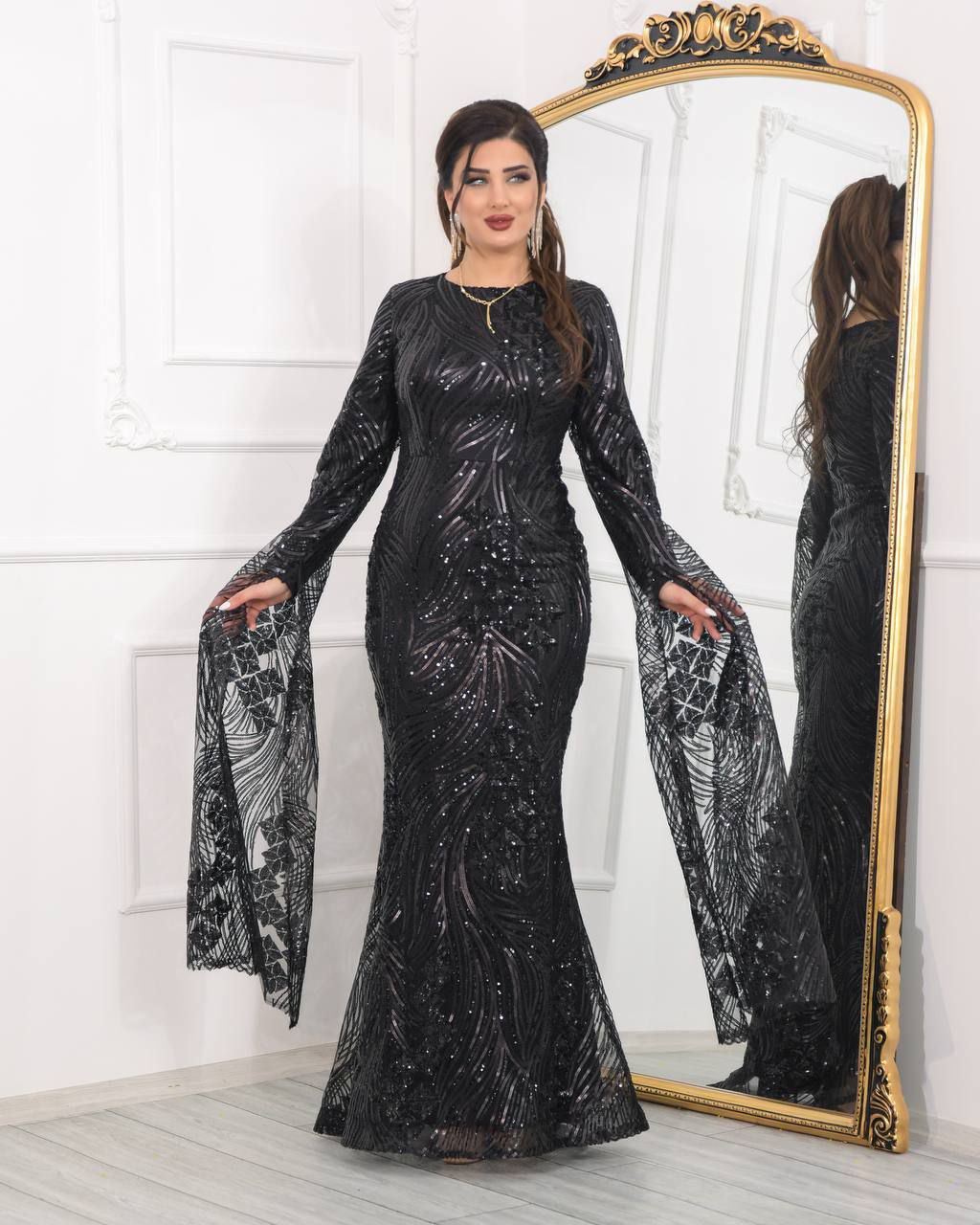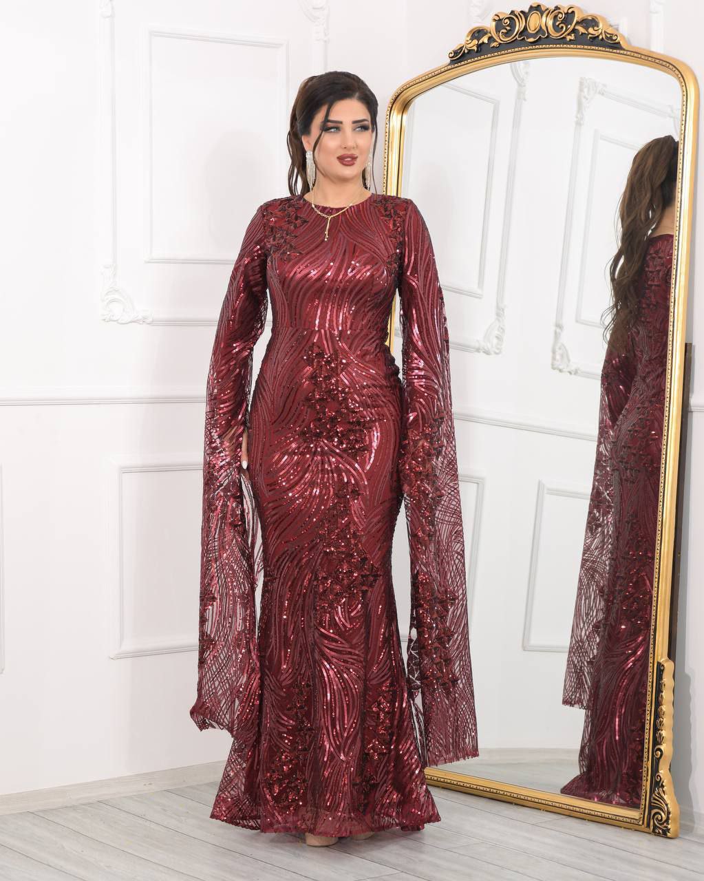 فستان سهرة ماروني رائع مزين بالترتر وأكمام طويلة. مصنوع من قماش عالي الجودة، ويتميز بتصميم أنيق مثالي للفعاليات الرسمية والحفلات. تضيف الترتر اللامعة لمسة من التألق والفخامة إلى إطلالتك.