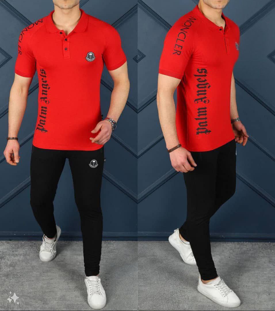 طقم رياضي من قطعتين للرجال، يتضمن تيشيرت بولو رمادي فحم وبنطلون رمادي فحم متناسق، مصنوع من مواد عالية الجودة، مريح للاستخدام اليومي أو أثناء التمارين الرياضية. يتميز بتصميم أنيق مع شعار Moncler ونص Palm Angels.