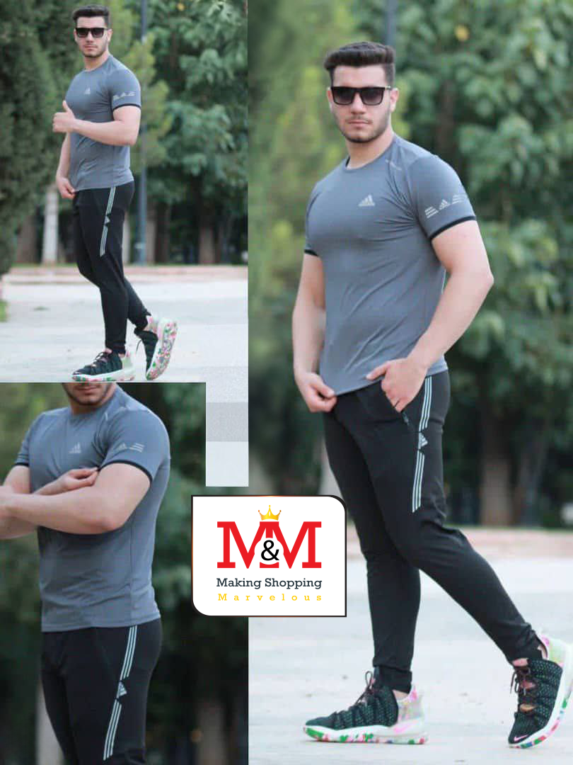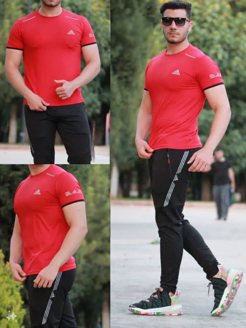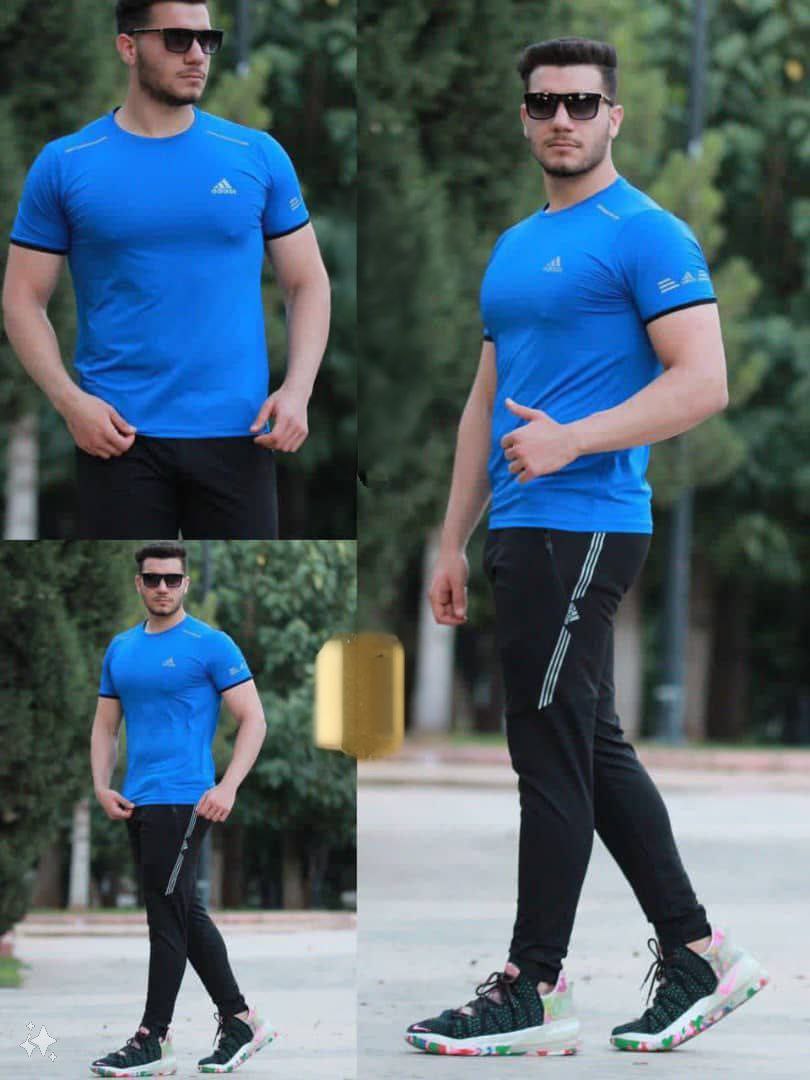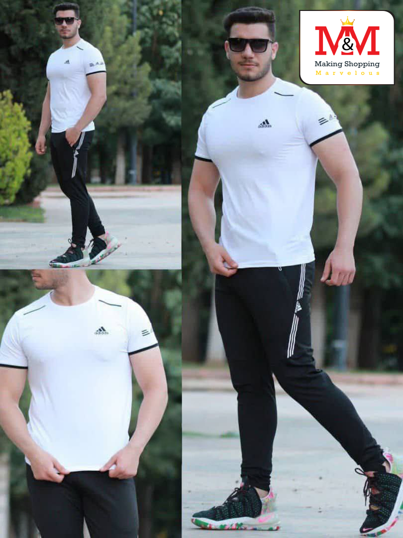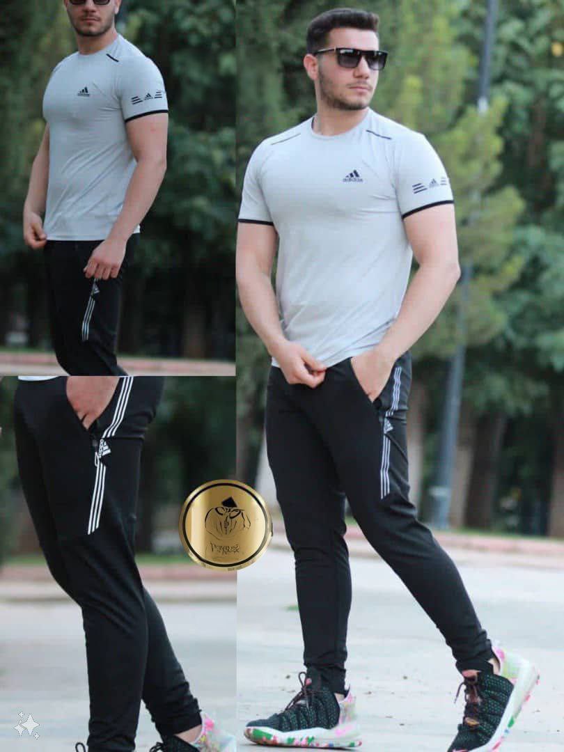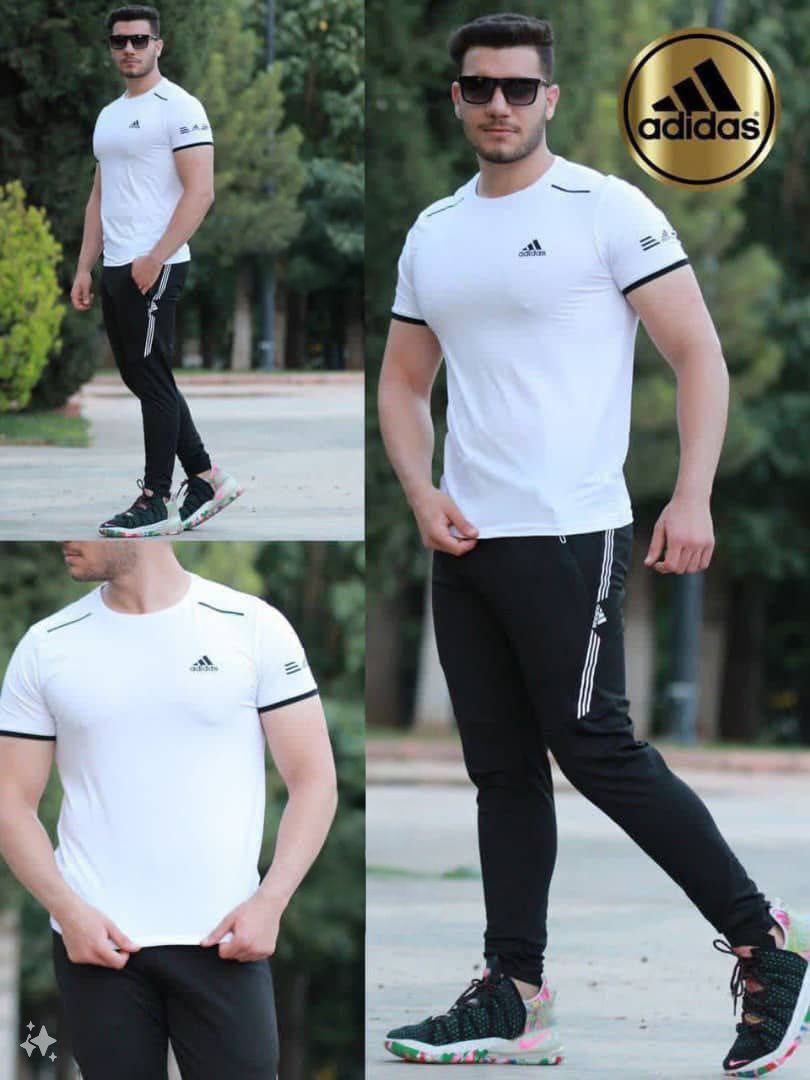طقم رياضي من قطعتين للرجال، يتضمن تيشيرت مع حواف متناسقة وبنطلون متناسق مع خطوط بيضاء، مصنوع من مواد عالية الجودة، مريح للاستخدام اليومي أو أثناء التمارين الرياضية. يتميز بتصميم أنيق مع شعار Adidas.