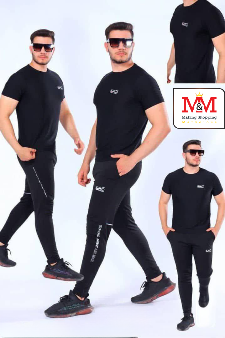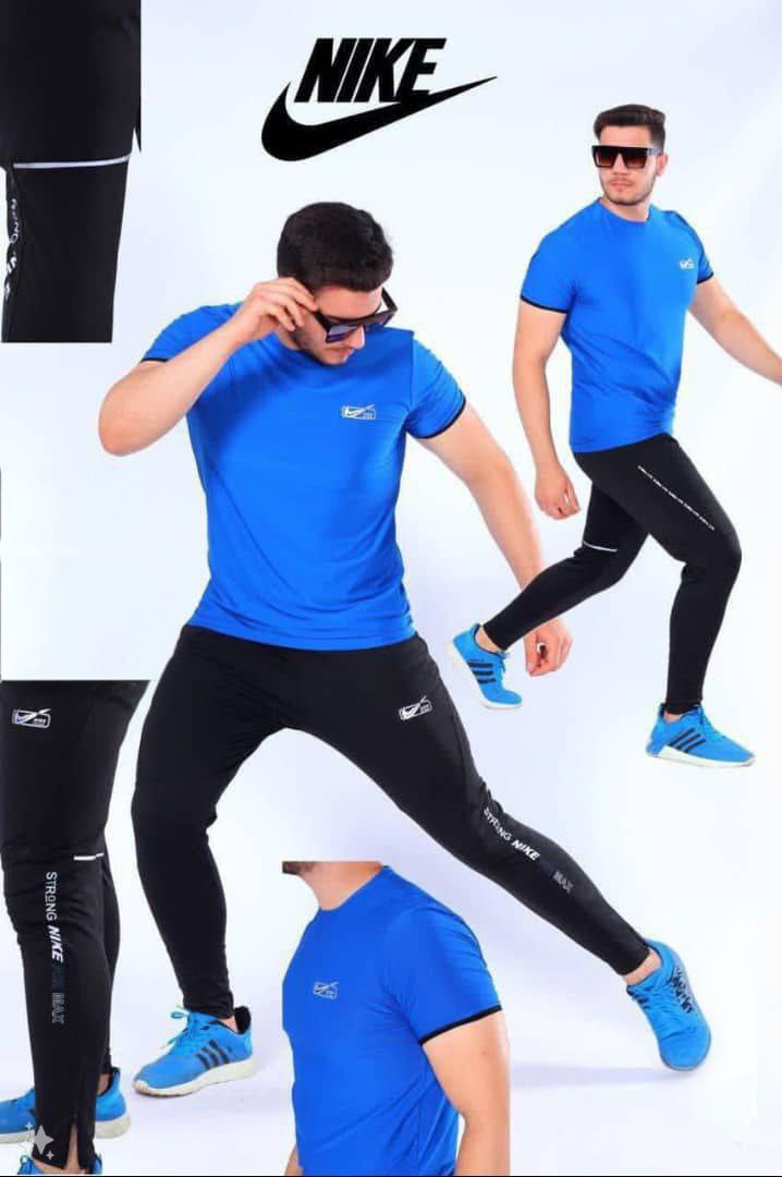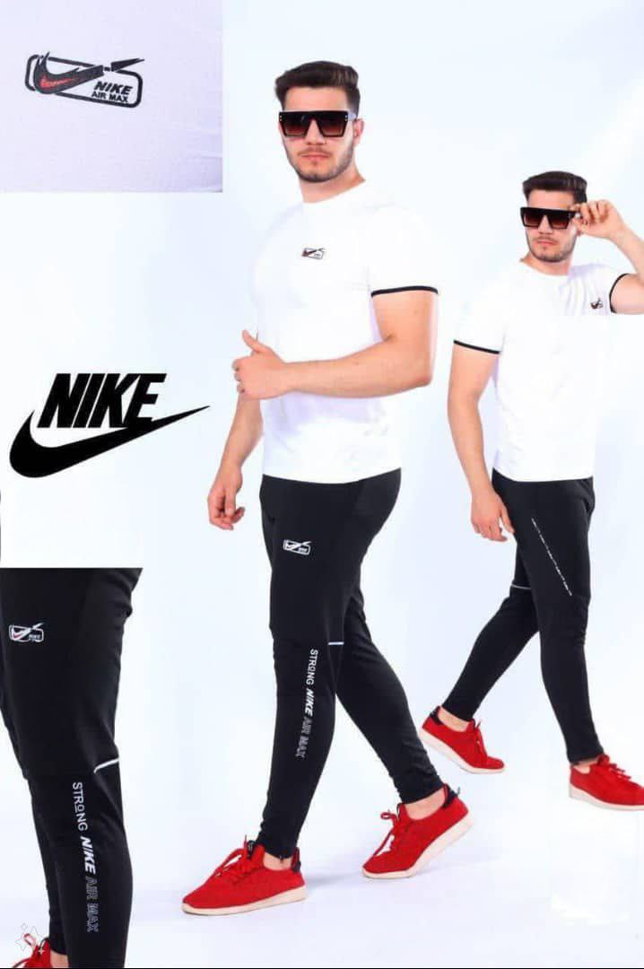 طقم رياضي من قطعتين للرجال، يتضمن تيشيرت مع حواف متناسقة وبنطلون متناسق مع لمسات نصية، مصنوع من مواد عالية الجودة، مريح للاستخدام اليومي أو أثناء التمارين الرياضية. يتميز بتصميم أنيق مع شعار Nike وتصميم رياضي.
