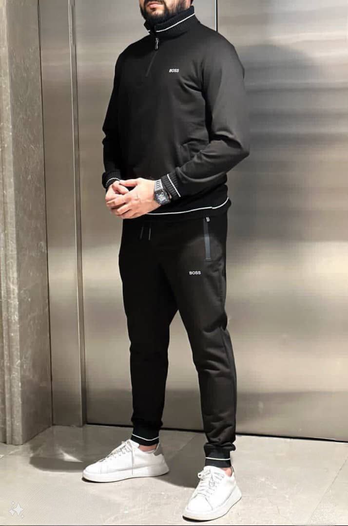 طقم رياضي رجالي من قطعتين، يتضمن سترة بسحاب وسروال أزرق بحري متناسق. مصنوع من مواد عالية الجودة لضمان الراحة أثناء الاستخدام اليومي أو التمارين. يتميز بشعار BOSS وتفاصيل أنيقة وعصرية