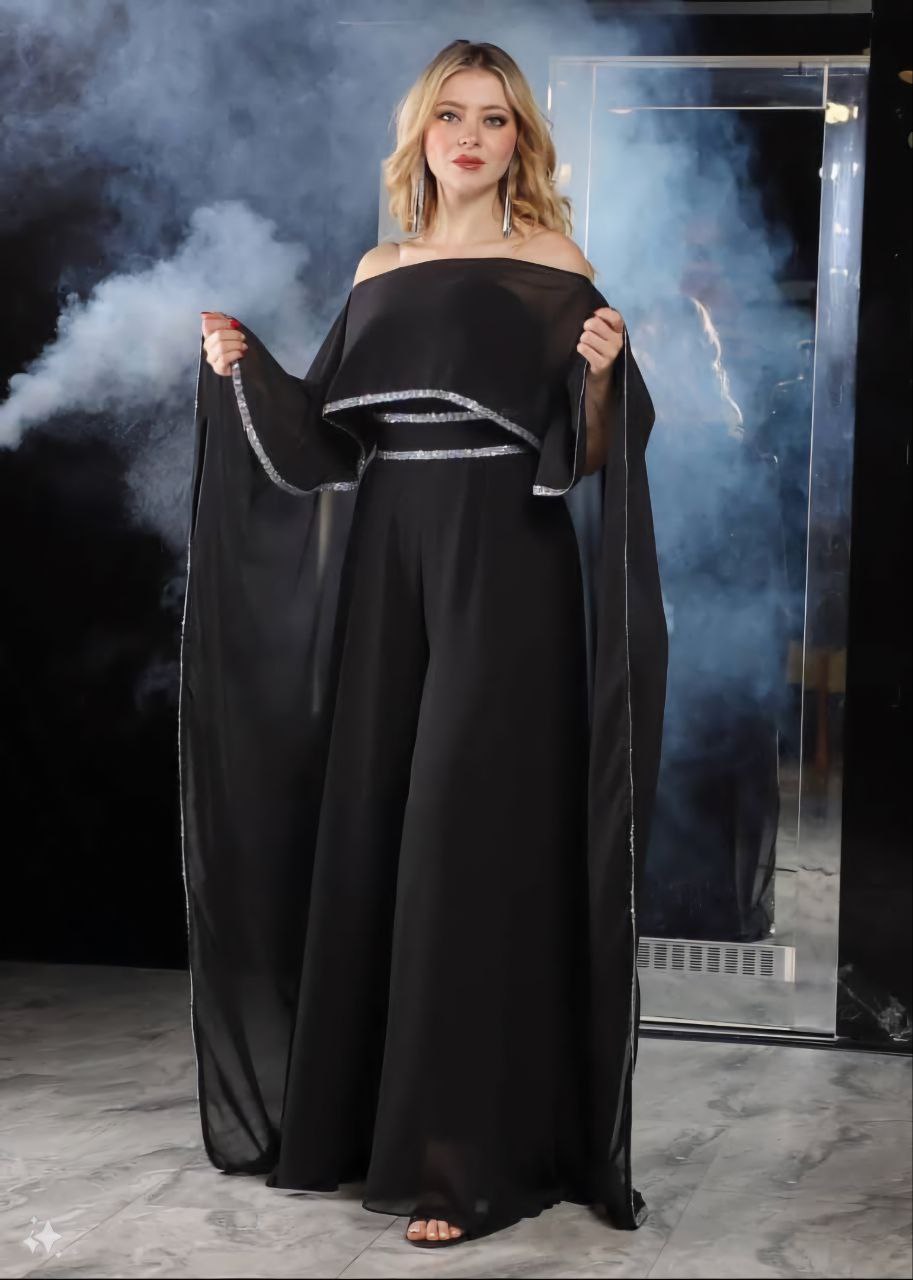 جديد ومتألق، بدلة جومبسوت سوداء بكتف مكشوف مثالية للأحداث الأنيقة والمناسبات الخاصة. تتميز هذه البدلة بتصميم أنيق للكتف المكشوف مع أرجل واسعة متدفقة وتفاصيل فضية خفيفة، مما يمنحها مظهراً عصريًا ومتطورًا يبرز في أي مناسبة.