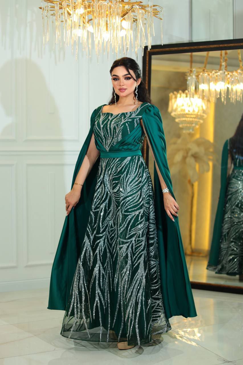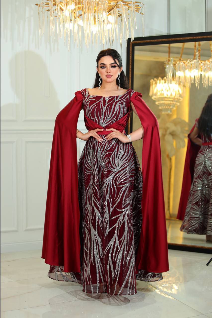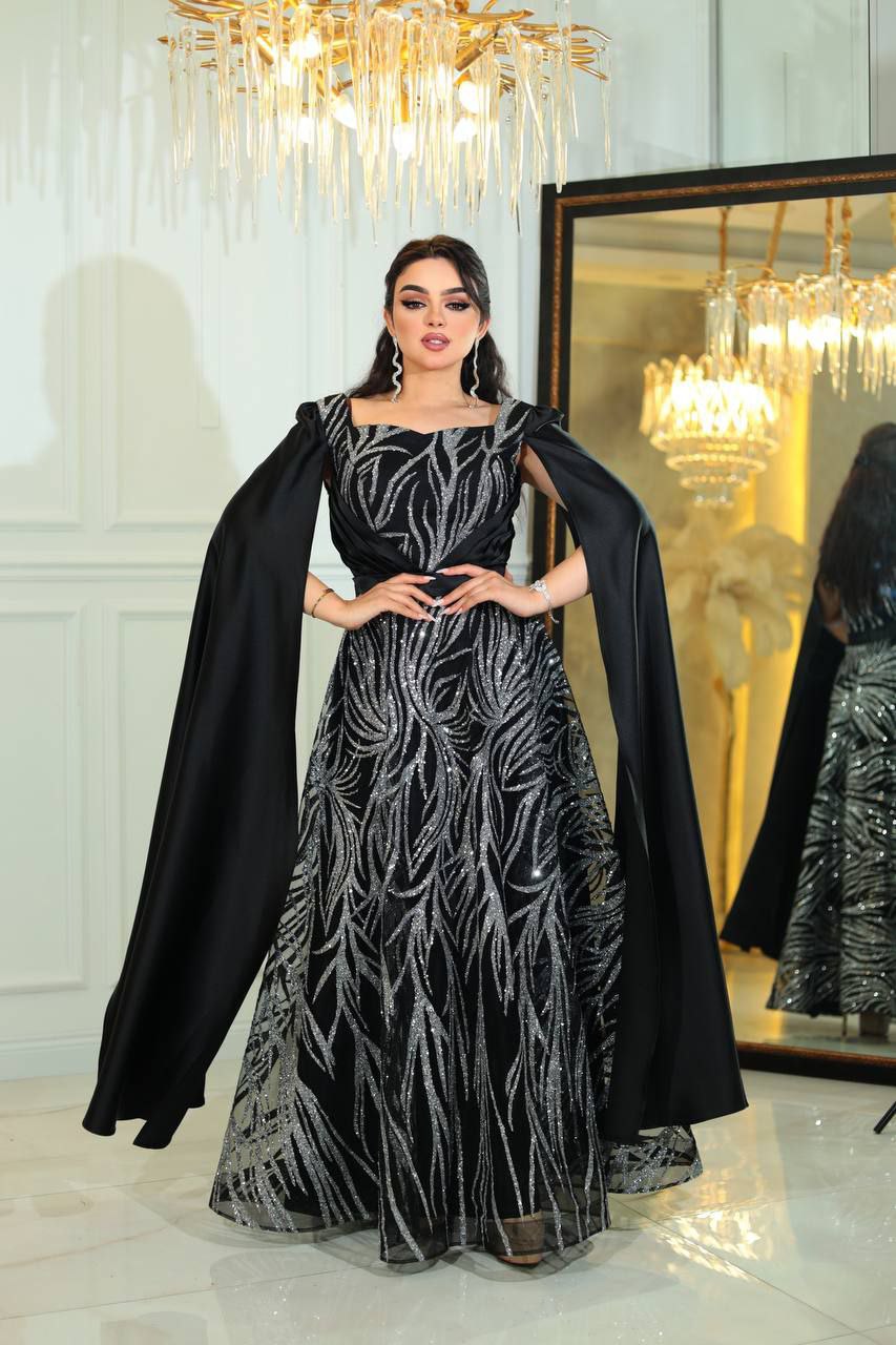 هذا الفستان المسائي الملكي يتميز بتفاصيل فضية رائعة وتصميم عباءة درامي. مصمم من مواد عالية الجودة، يضمن لك الراحة والمظهر الملكي، مما يجعله مثالياً للمناسبات الخاصة والأحداث الرسمية.