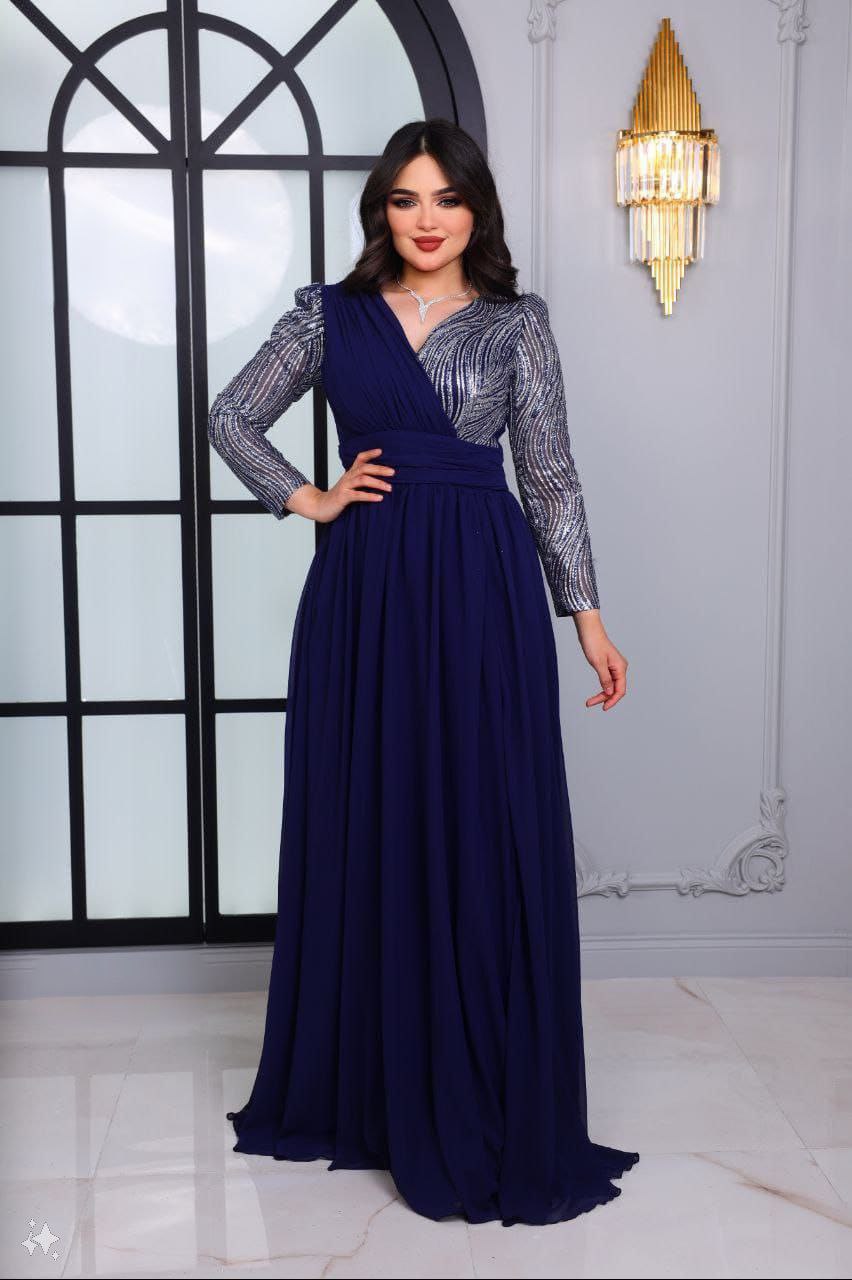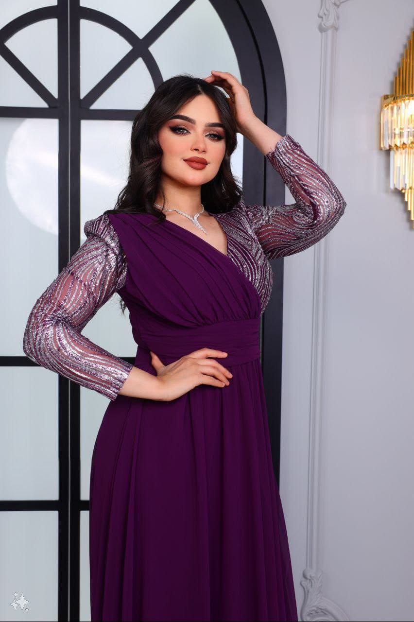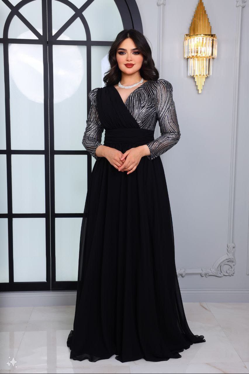 فستان سهرة رائع مزين بخيوط الترتر، مثالي للأحداث الرفيعة والمناسبات الخاصة. يتميز الفستان بتصميم مذهل مع أكمام مزينة بالترتر وتنورة متدفقة، مما يوفر مزيجاً مثالياً من الأناقة والسحر.