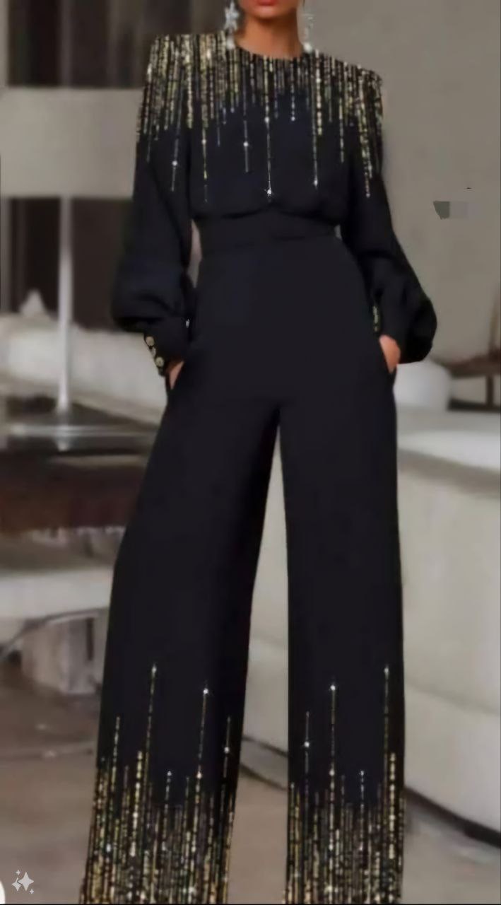 جمبسوت أنيق مزين بالترتر وحزام متطابق. هذه القطعة العصرية والعصرية مثالية للأمسيات والمناسبات الخاصة، حيث توفر مظهراً أنيقاً ومتألقاً