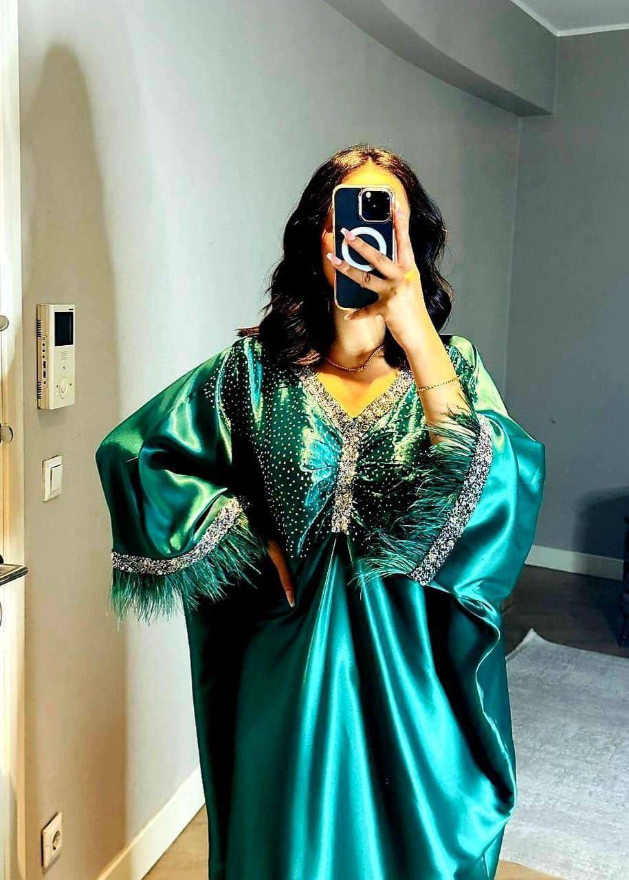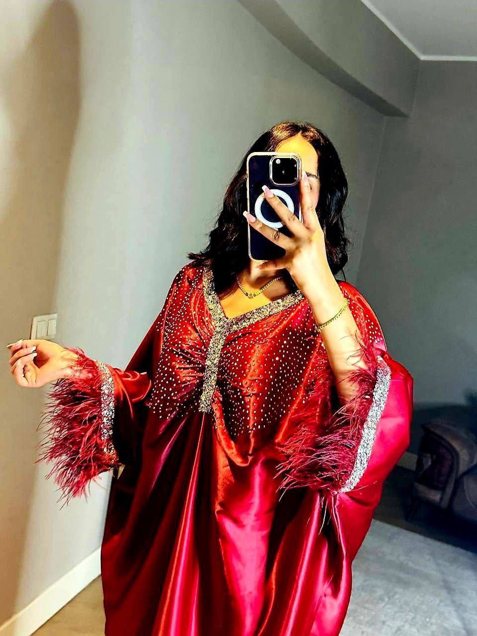عباءة سهرة من الحرير الفاخر بتصميم أنيق مزين بتفاصيل مزخرفة على الصدر والأكمام. تتميز بأكمام مزينة بالريش لإضافة لمسة من الفخامة. مثالية للمناسبات الخاصة والحفلات، تجمع بين الراحة والفخامة