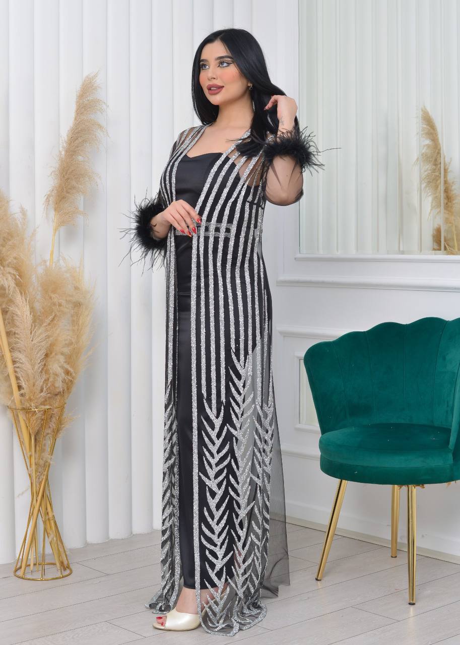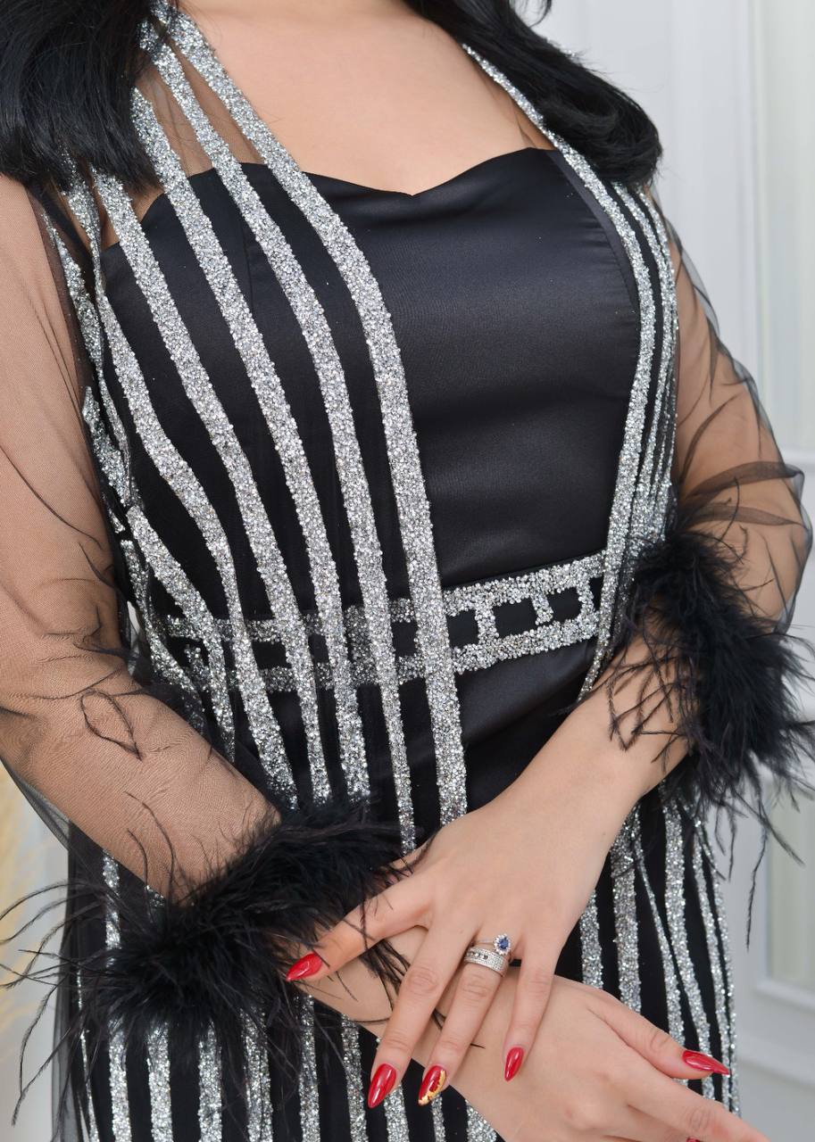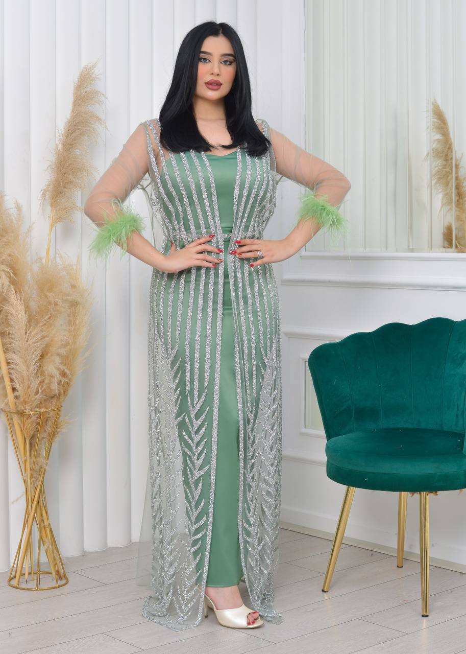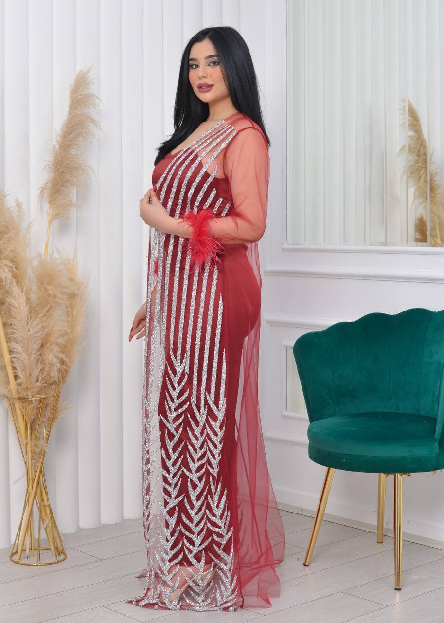 فستان سهرة أنيق بأكمام من الدانتيل الشفاف وتفاصيل لامعة. يتميز بتصميم عصري وجذاب، مثالي للحفلات والمناسبات الخاصة