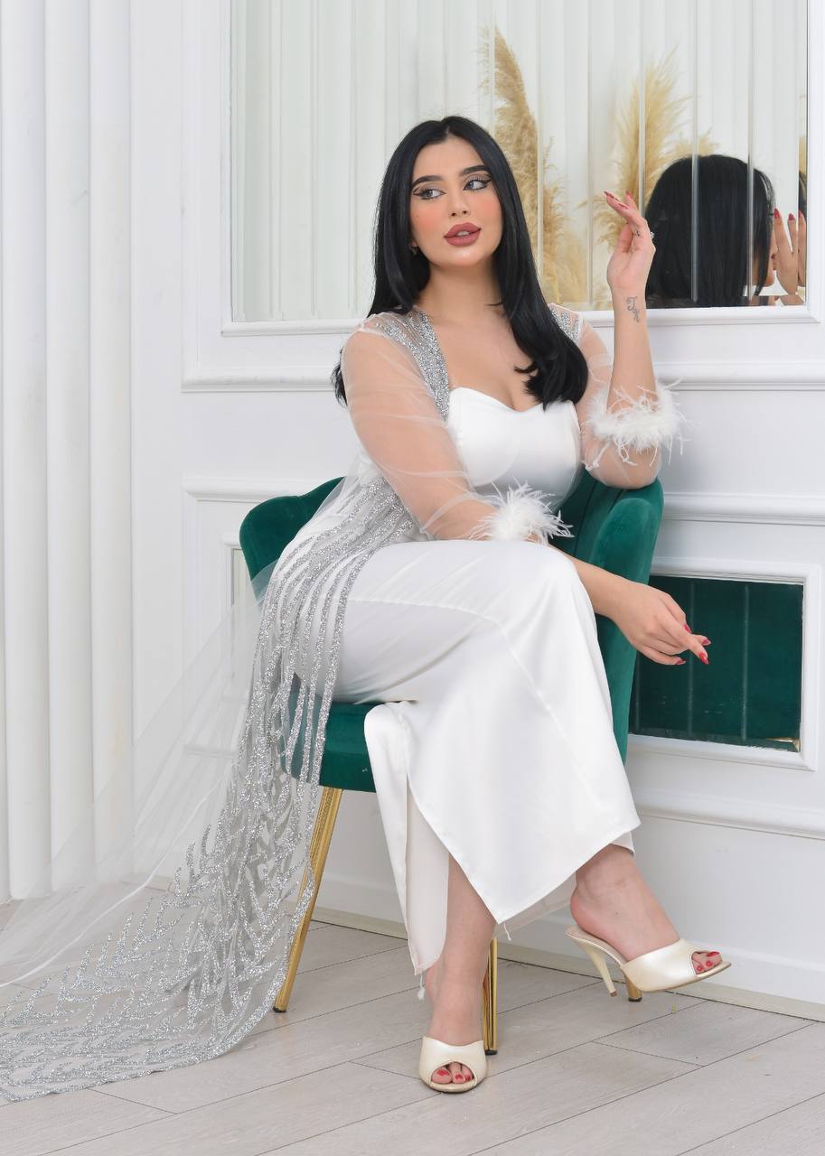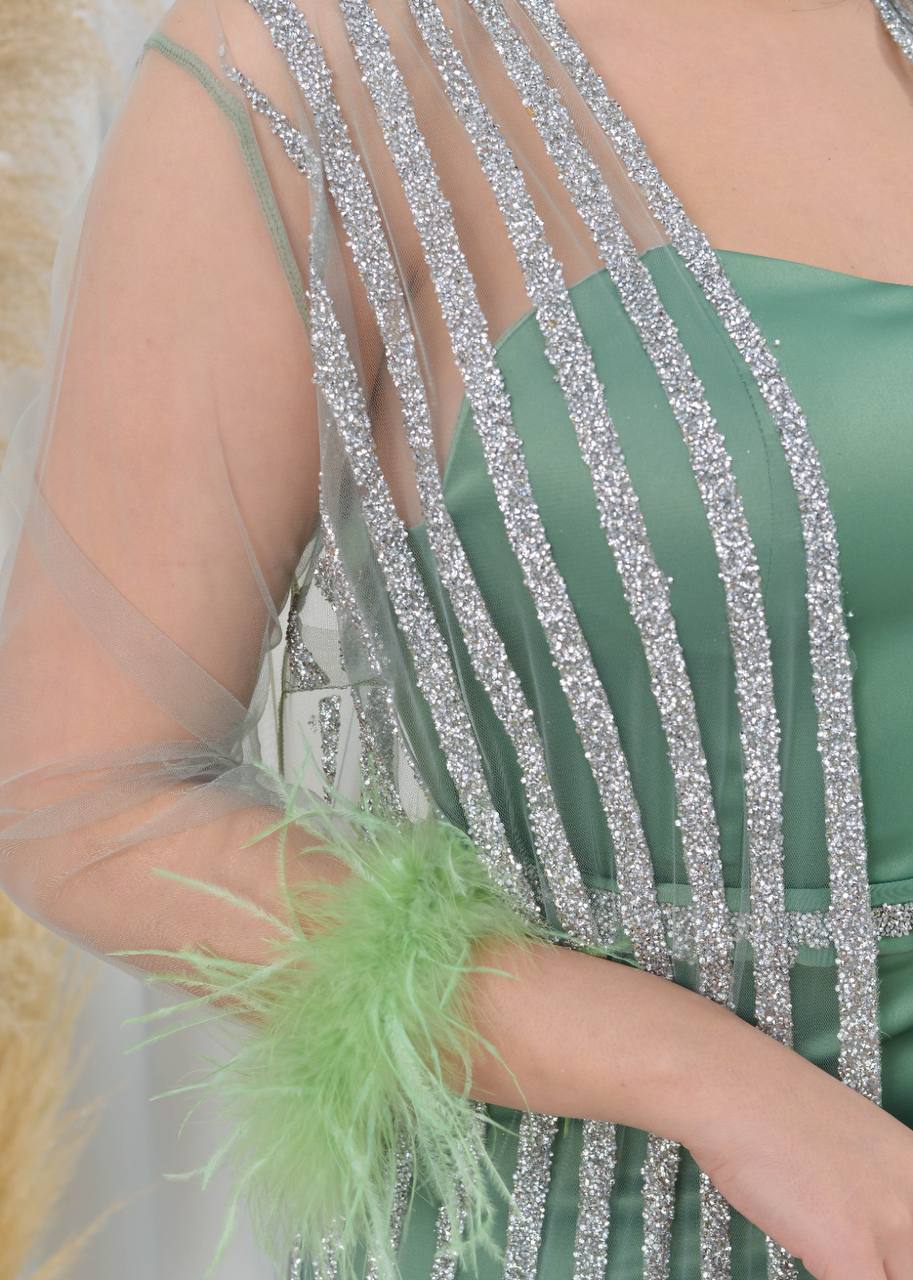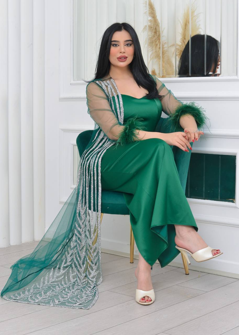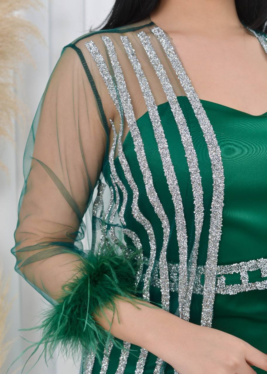 فستان سهرة أنيق بأكمام من الدانتيل الشفاف وتفاصيل لامعة. يتميز بتصميم عصري وجذاب، مثالي للحفلات والمناسبات الخاصة