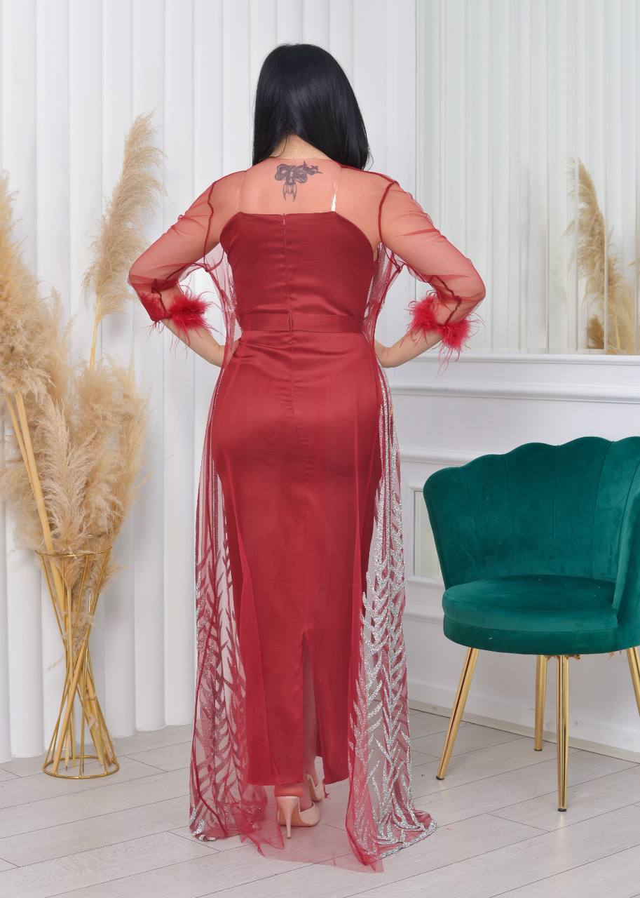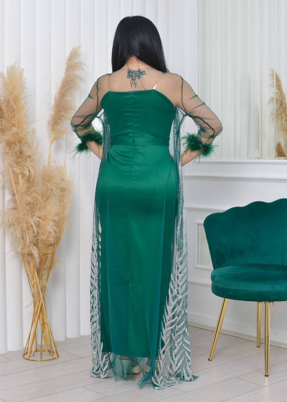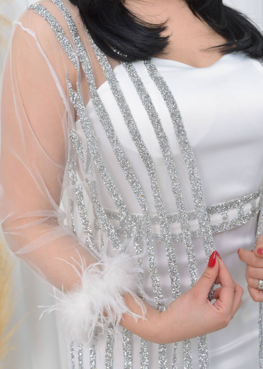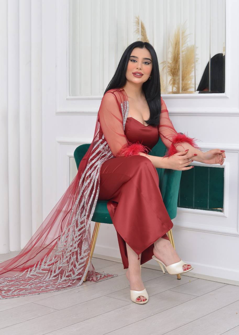 فستان سهرة أنيق بأكمام من الدانتيل الشفاف وتفاصيل لامعة. يتميز بتصميم عصري وجذاب، مثالي للحفلات والمناسبات الخاصة