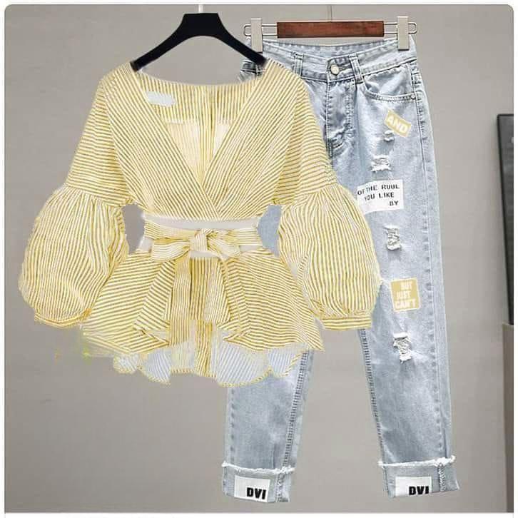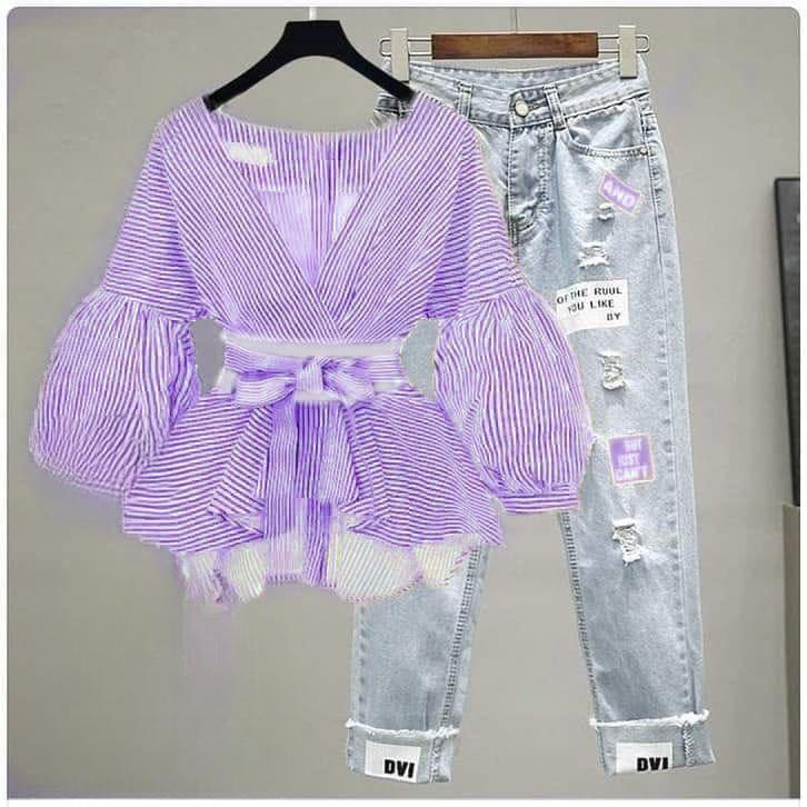 مجموعة نسائية عصرية تتميز ببلوزة مخططة بتصميم واسع وحزام خصر، مقترنة بجينز ممزق بتفاصيل حديثة. مثالي للملابس اليومية والنزهات غير الرسمية. مصنوعة من مواد عالية الجودة لضمان الراحة والمتانة.