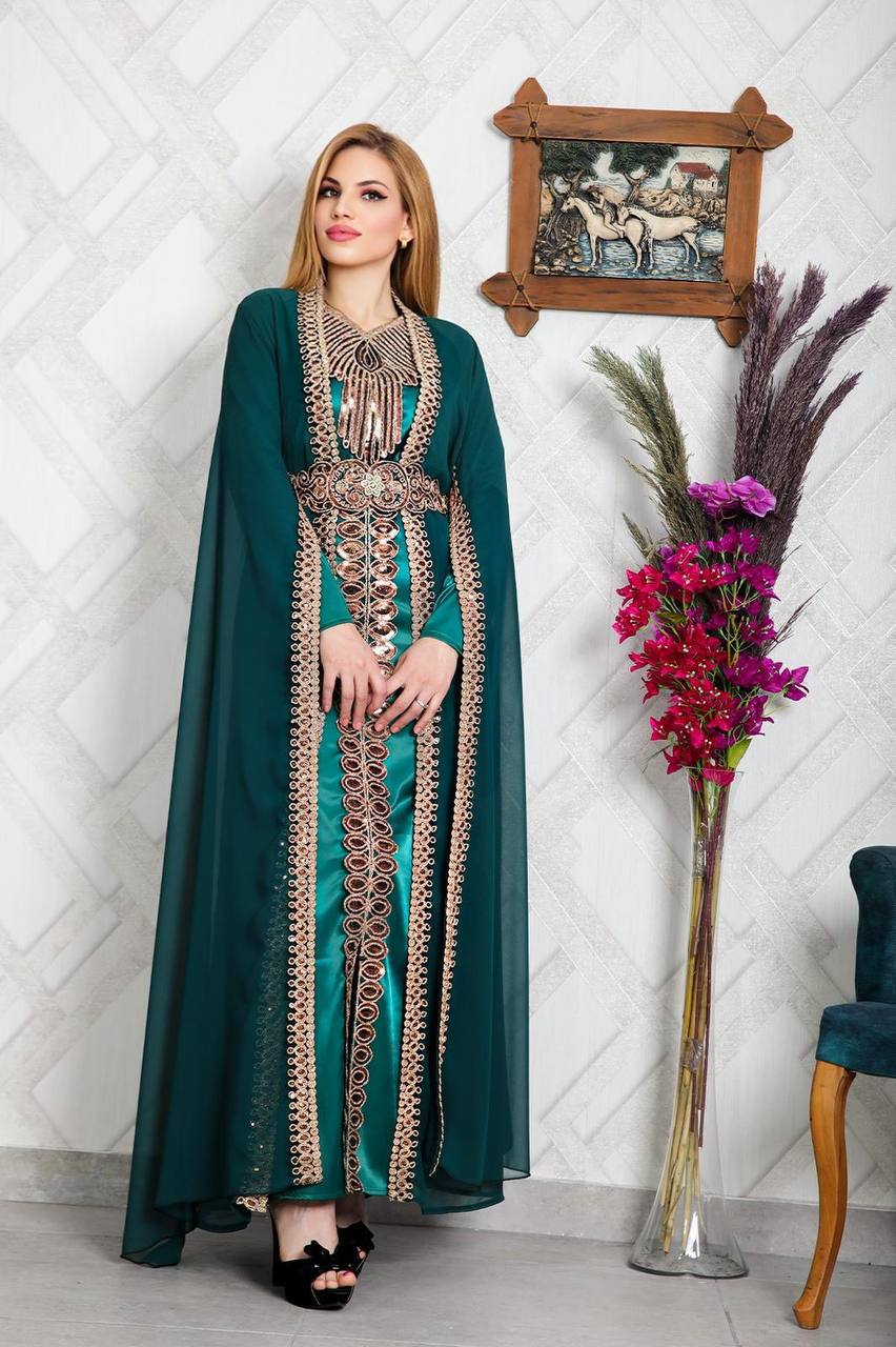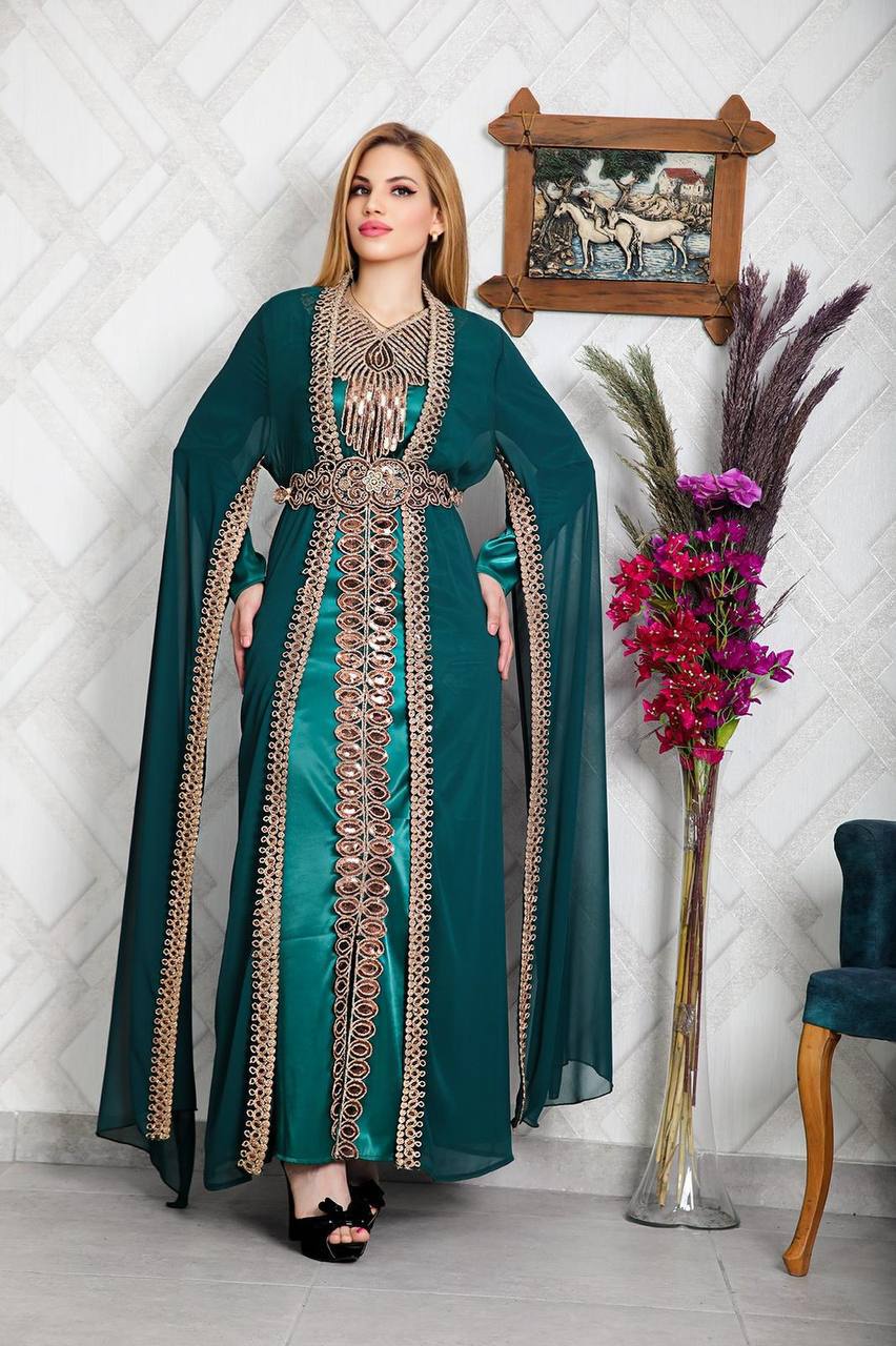 فستان مغربي تقليدي مصنوع من أقمشة عالية الجودة، بتصميم فاخر يشمل تطريزات جميلة. مثالي للمناسبات الخاصة والعطلات