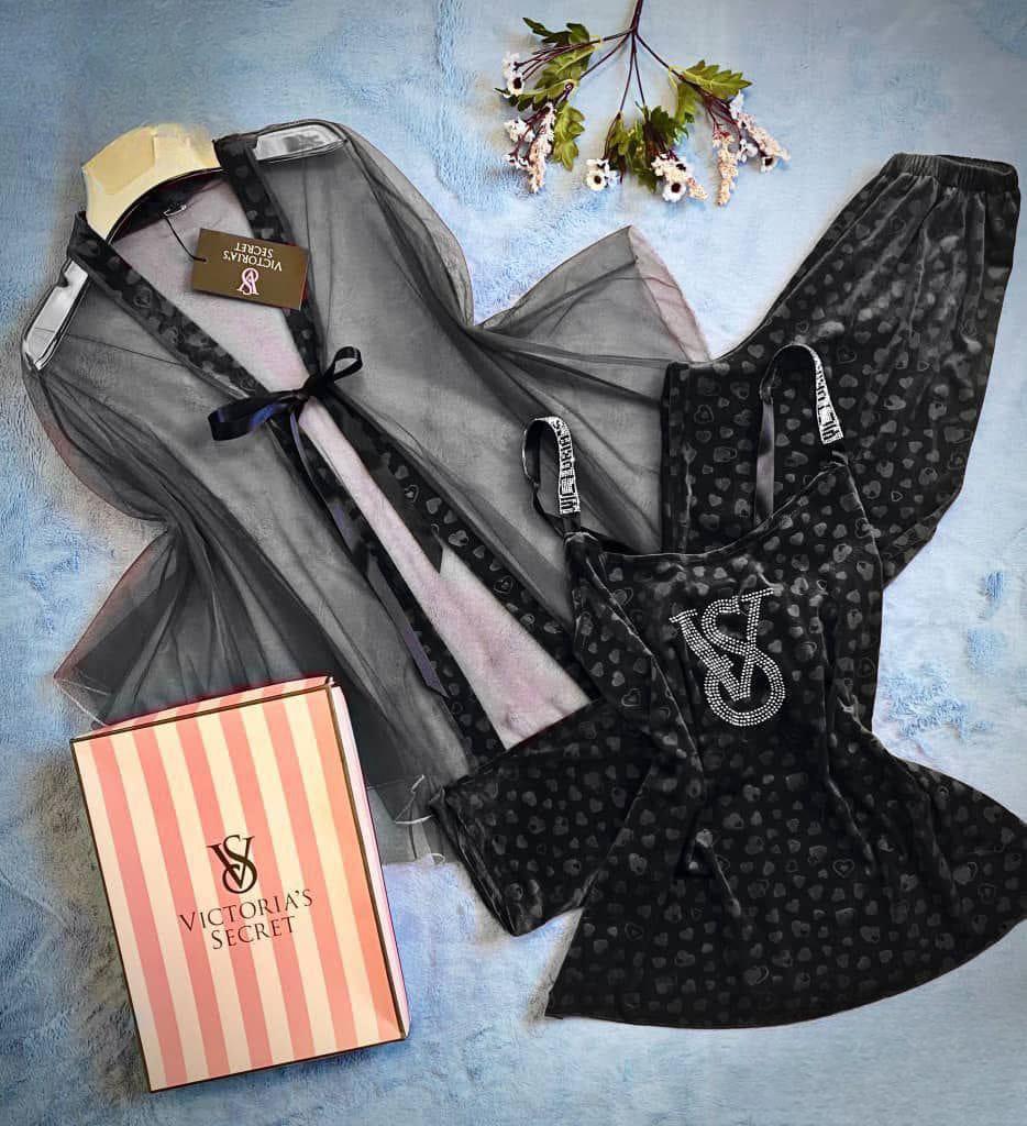 مجموعة ملابس داخلية فاخرة من Victoria's Secret تشمل بلوزة شفافة مزينة بتفصيلة برباط وسروال مخملي باللون الأخضر الداكن. تصميم أنيق وراحة مثالية للنوم.