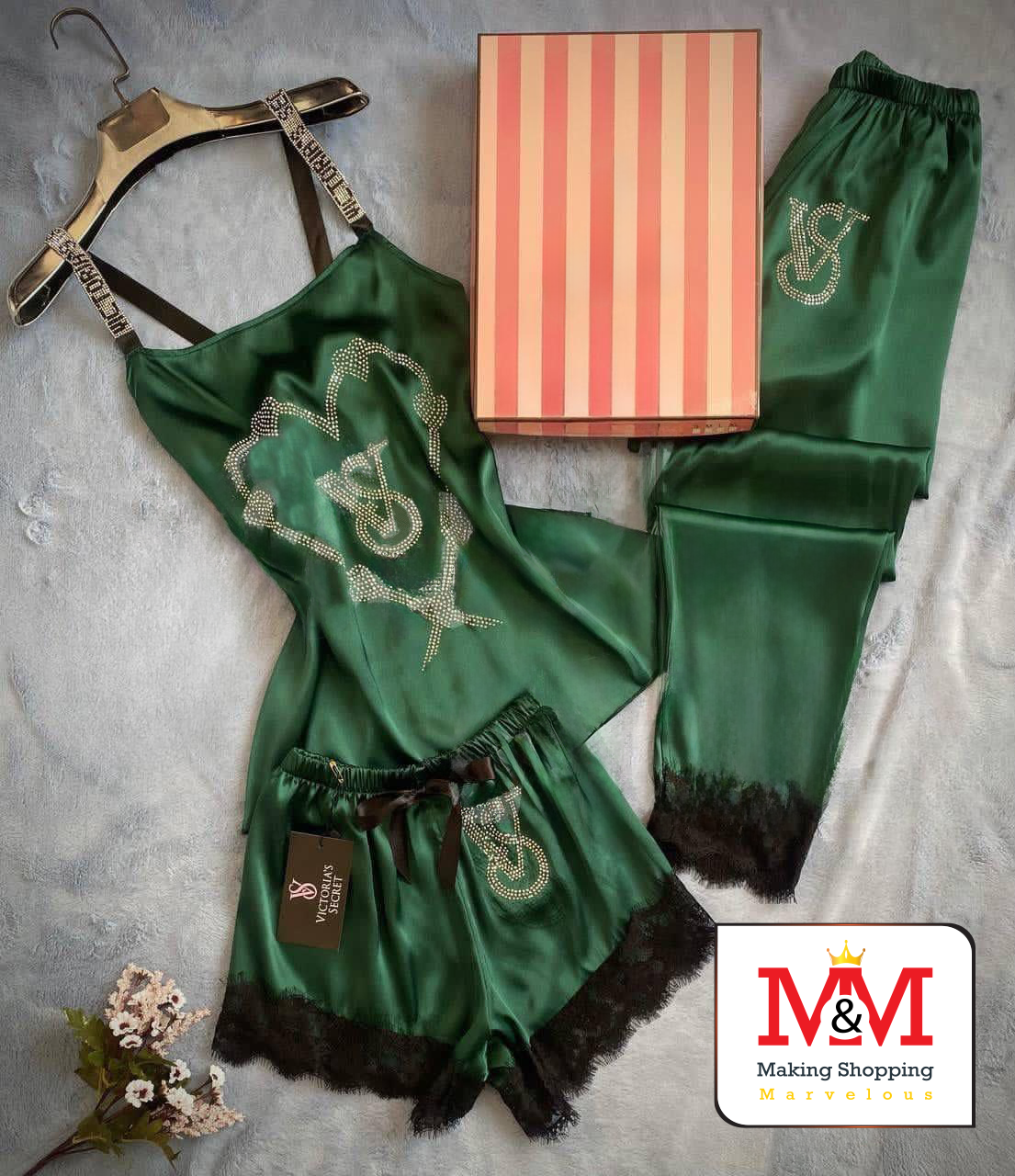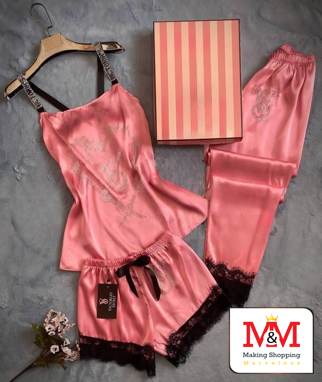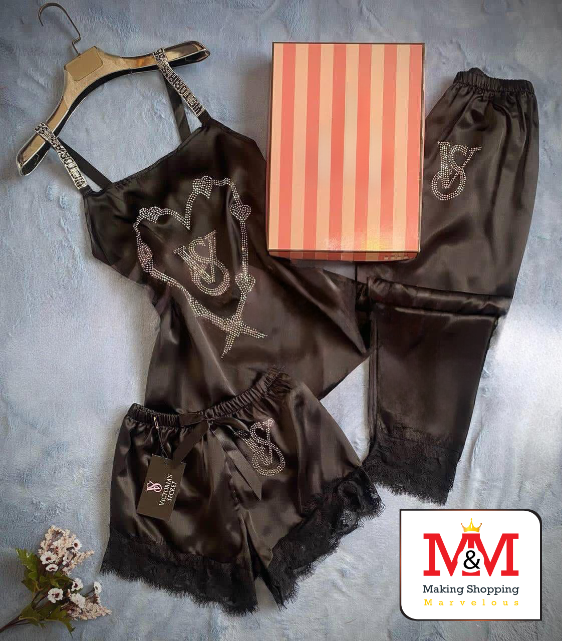 طقم بيجاما فاخر من فيكتوريا سيكريت مصنوع من الحرير الناعم مع تفاصيل من الدانتيل الأنيق. يتضمن الطقم قميصًا مزينًا بالكريستال، وشورتًا، وسروالًا، مما يوفر الراحة والأناقة طوال الليل. تأتي البيجاما في علبة أنيقة، مما يجعلها هدية مثالية لأحبائك